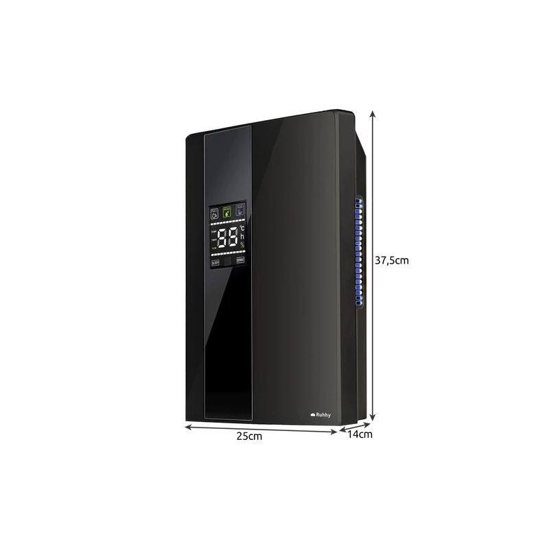 - MŰSZAKI ADATOK - fekete szín; anyaga: fém / műanyag; kijelző: LCD, mutatja: hőmérséklet és páratartalom; időzítő: 24 óra; 2 az 1-ben légtisztítás és párátlanítás; 0 alatti hőmérsékleten való munkavégzés képessége: igen -5oC-ig; automatikus leolvasztás funkció; szoba mérete: 30m2-ig; tisztítás: UV fényt és titán-dioxid (TiO2) tisztítási technológiát használ a szennyező anyagok lebontására a levegőből; párátlanító kapacitás: akár 700 ml naponta 25oC-on és 85%-os páratartalom mellett; víztartály kapacitása: 1500 ml; a víz elvezetésének lehetősége a tömlőn keresztül: igen; feszültség: 220-240V; teljesítmény: 65W; automatikus leállítás a tartály feltöltése után: igen; működési mód: Peltier-rendszer alapján; alkalmas: otthoni, irodai stb. méretek: 36 x 24 x 13cm; tömlő hossza: 100 cm; kábelhossz:1,2m; súlya: 2 kg; súly a csomagban: 2,372 kg.
