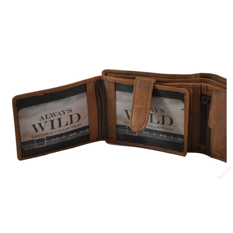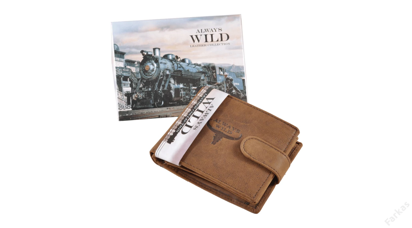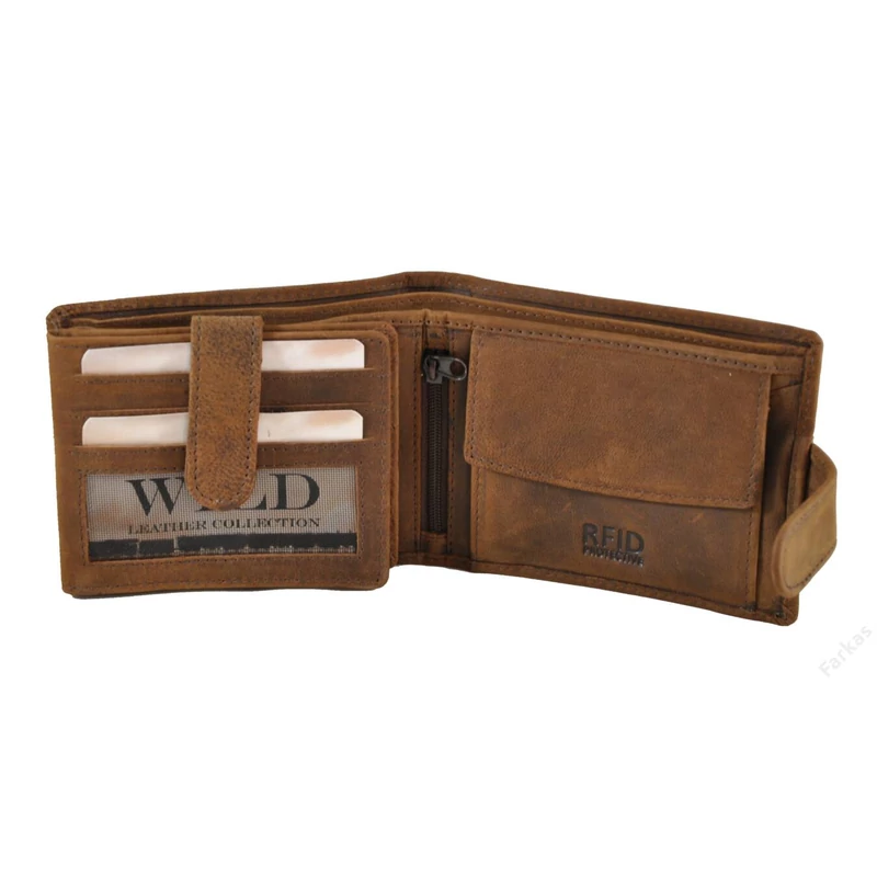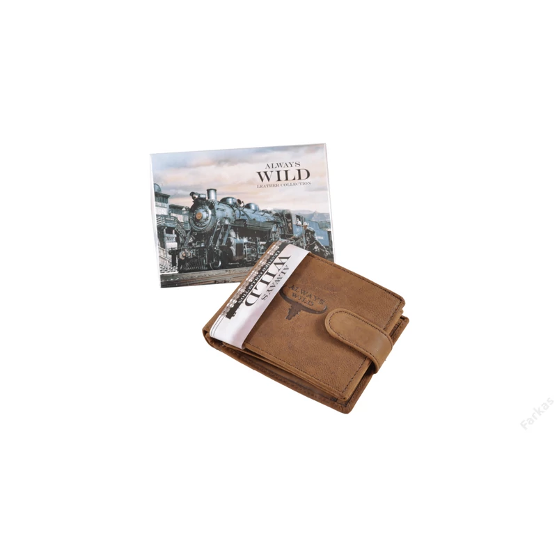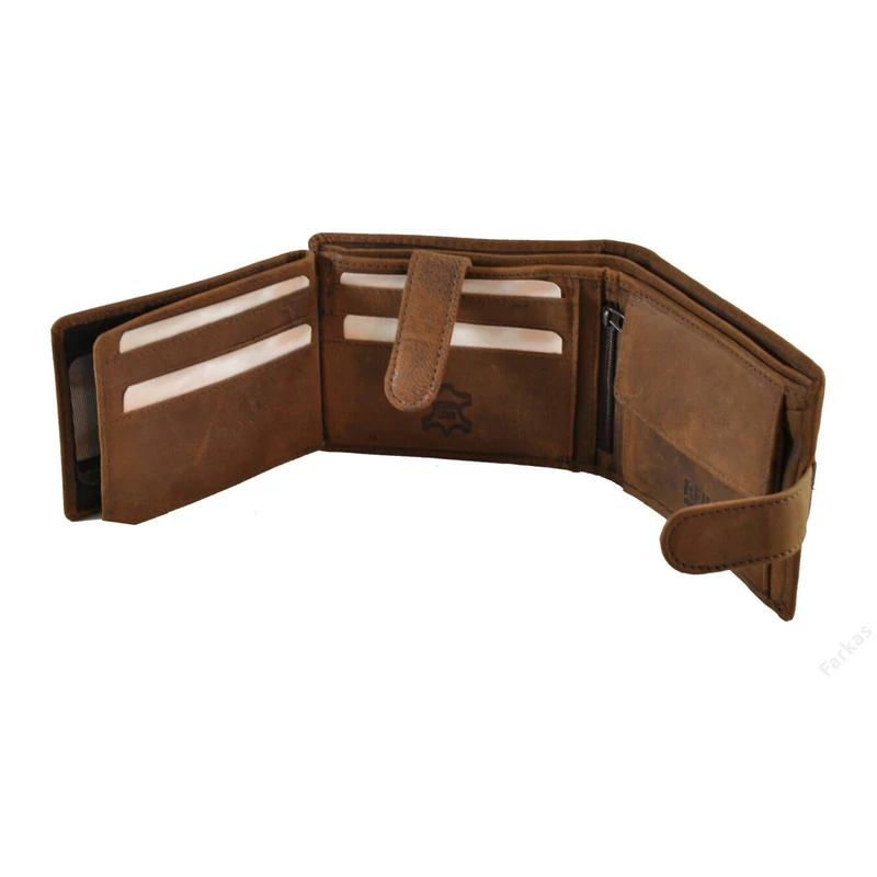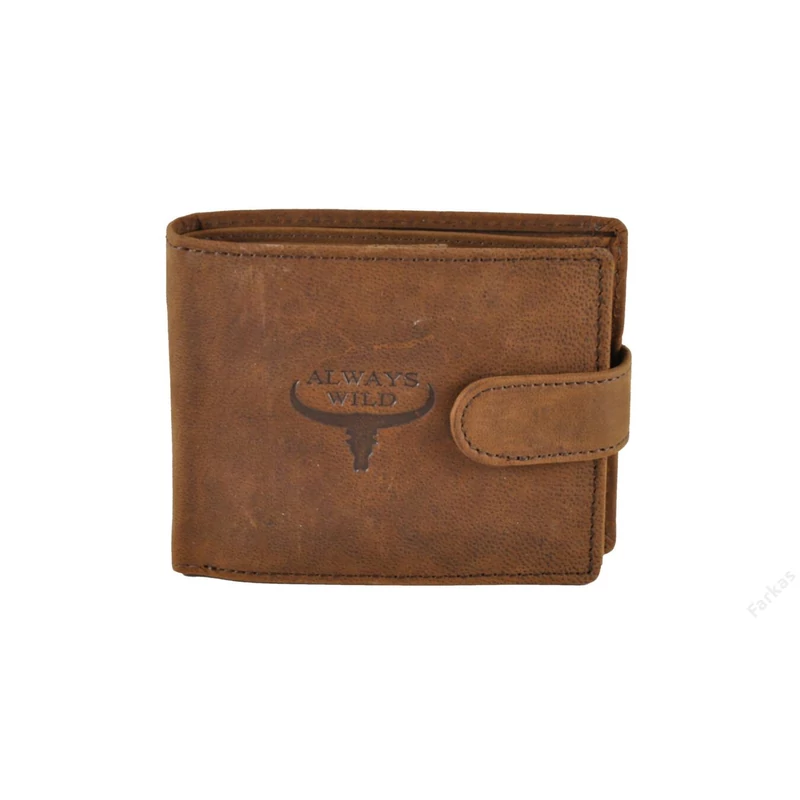 Férfi pénztárca kiváló minőségű, koptatott "hunter" bőrből, amelyet egy bikafej díszít. Az elrendezése praktikus és klasszikus: Fedele patentos átkapcsolóval nyitható. Két rekeszes papírpénztartóval, négy igazolványtartó zsebbel, egy patenttal nyíló aprópénztartóval és összesen 9 kártyatartó hellyel rendelkezik, ebből 1 "ablakos"; a kártyatartó része patenttal nyílik és kifele lebeg. A pénztárca gerincén belül egy cipzáras zseb kapott még helyet, ahová nagyobb értékű papírpénzünket tudjuk elrejteni.