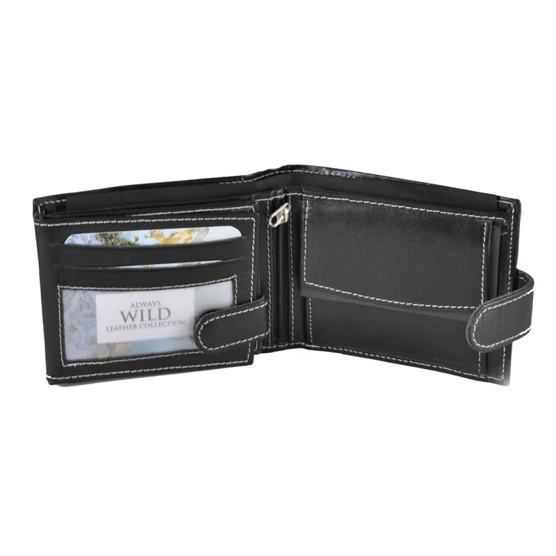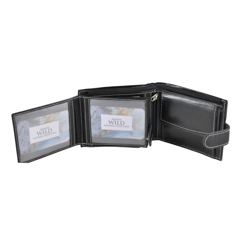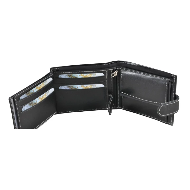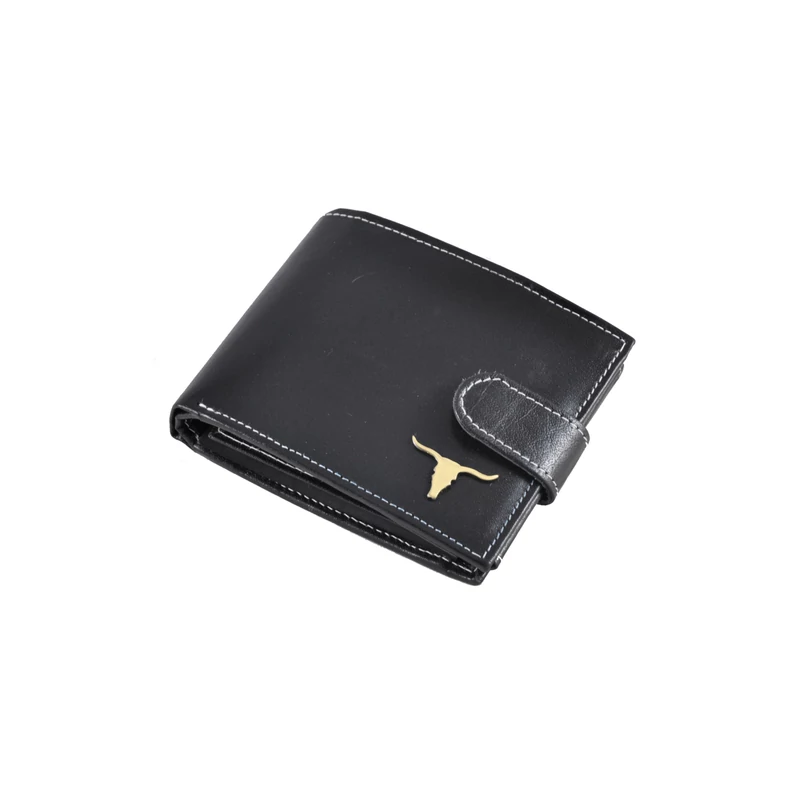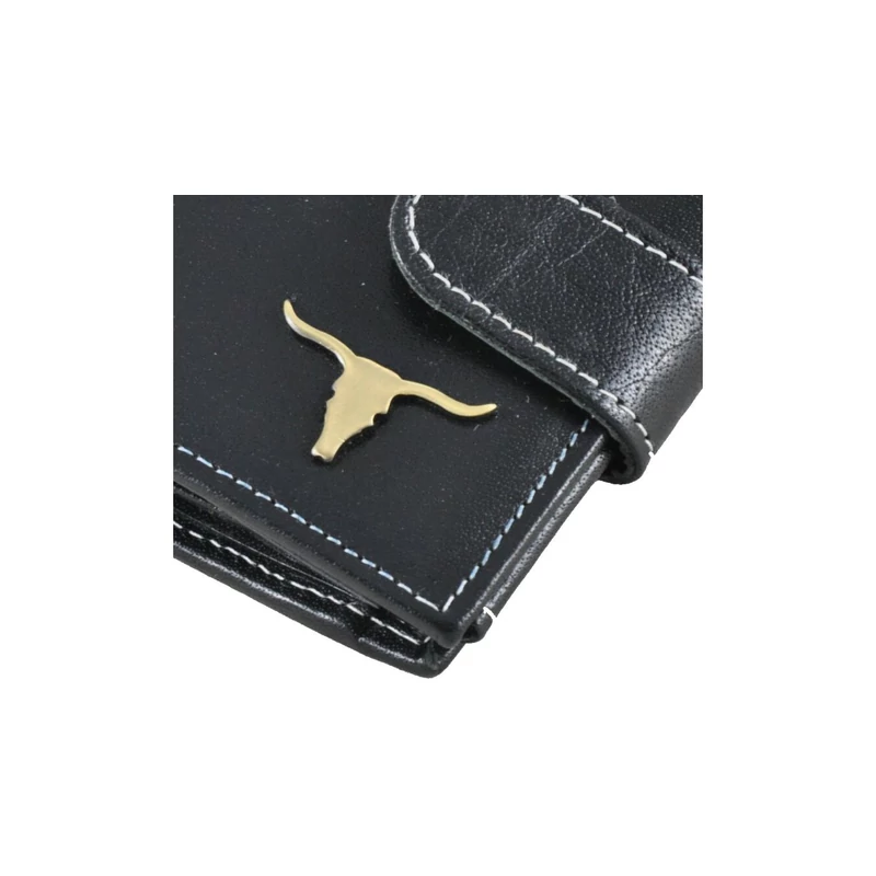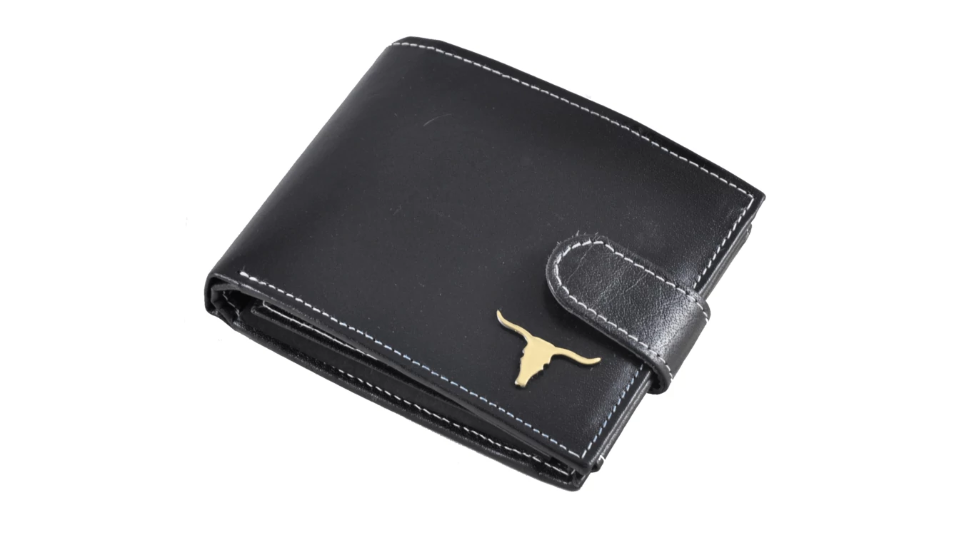 Férfi pénztárca kiváló minőségű bőrből, amelyet egy fehér varrás és egy bivalyfej logó díszítenek. Fedele patentos átkapcsolóval nyitható. Két rekeszes papírpénztartóval, kettő igazolványtartó zsebbel, egy patenttal nyíló aprópénztartóval és összesen 10 kártyatartó hellyel rendelkezik, ebből 3 "ablakos"; a kártyatartó része patenttal nyílik és kifele lebeg. A pénztárca gerinc