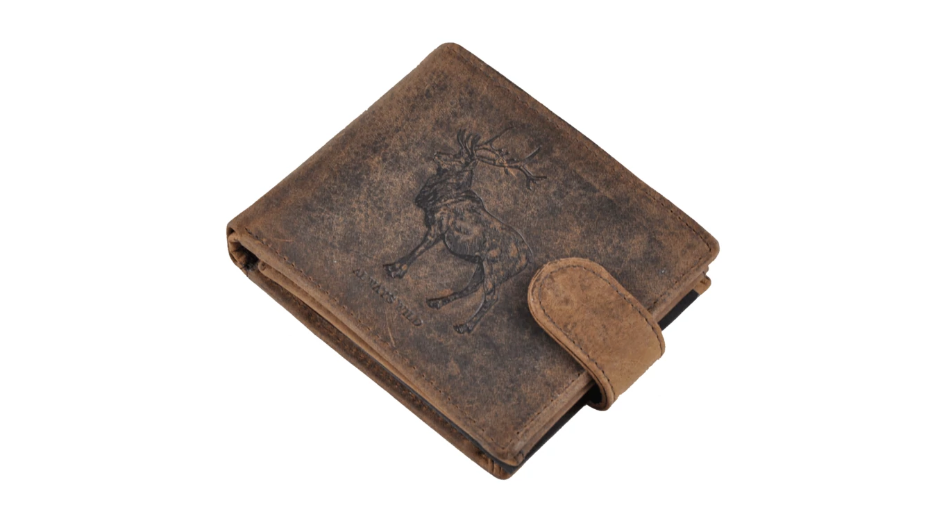 Férfi pénztárca kiváló minőségű, koptatott "hunter" bőrből, amelyet egy szarvas minta díszít. Az elrendezése praktikus és klasszikus: Fedele patentos átkapcsolóval nyitható. Két rekeszes papírpénztartóval, kettő igazolványtartó zsebbel, egy patenttal nyíló aprópénztartóval és összesen 10 kártyatartó hellyel rendelkezik, ebből 3 "ablakos"; a kártyatartó része patenttal nyílik és kifele lebeg. A pénztárca gerincén belül egy cipzáras zseb kapott még helyet, ahová nagyobb értékű papírpénzünket tudjuk elrejteni.