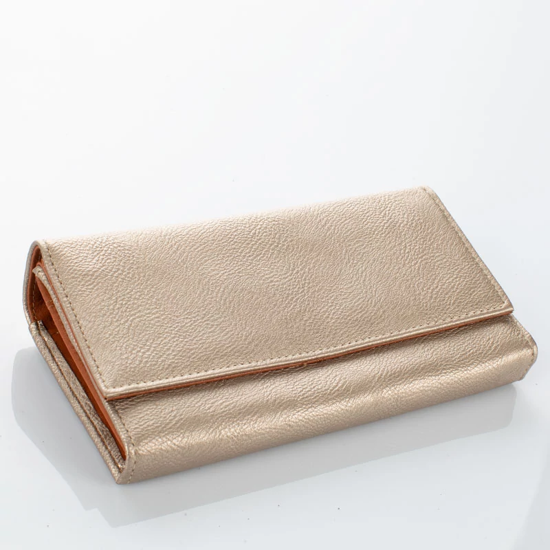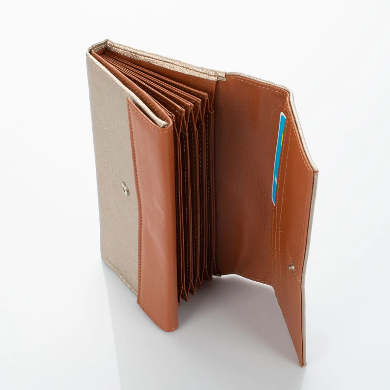 Praktikus, jól pakolható belsővel készült, melyben egy hatrészes papírpénztartó,patentos aprópénztartó, 4db kártyatartó és irattartó is található.
