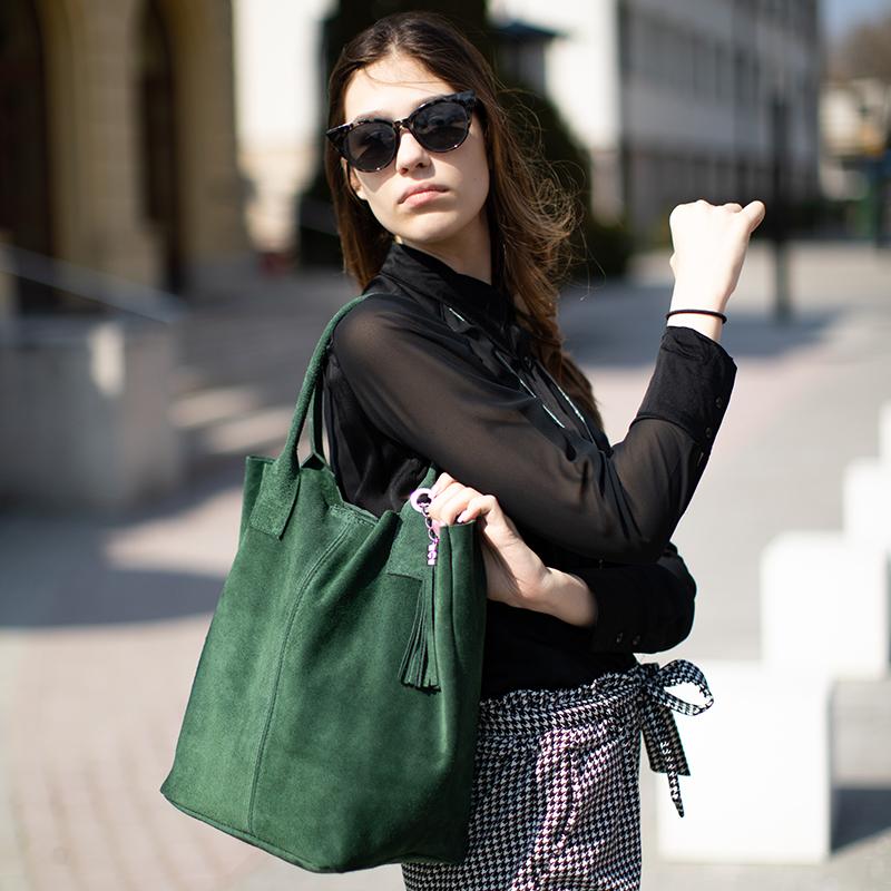 Valódi velúrbőrből készült olasz női shopper táska, divatos zöld színben. Nagyméretű, könnyű táska,amibe minden holmidat belepakolhatod. A táska fő zsebében található egy belső kis neszesszer, ami egy ezüstszínű lánccal kapcsolódik a táskához. Tökéletes célt szolgál például a kulcsainknak, így nem vész el a táska aljában. Egyszerű, letisztult külseje miatt kiváló választás a mindennapokra, akár hivatalos, üzleti megjelenésekre is.