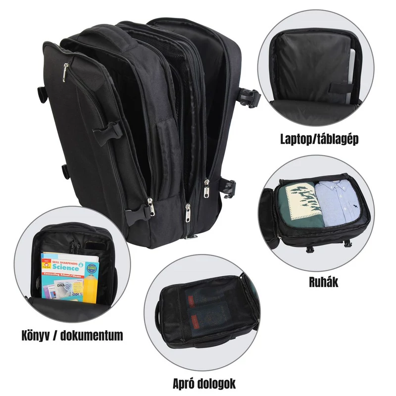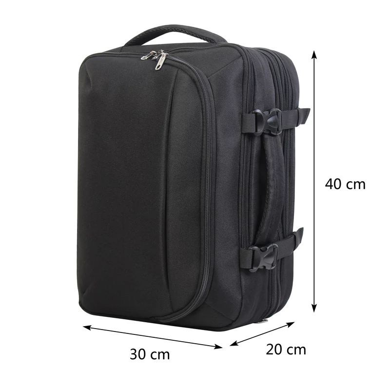 WizzAir-méretű laptophátizsák , kabintáska. Kézben és szivacsos, állítható vállpántjainak, valamint szintén szivacsos hátrészének köszönhetően háton kényelmesen hordható, a bőröndkulira ráhúzható. A hátizsák speciális mérete lehetővé teszi, hogy ingyenesen felvigyük a WizzAir légijáratainak fedélzetére.Fedélzeti hátizsák, amely legtöbb fapados légitársaság fedélzetére felvihető.