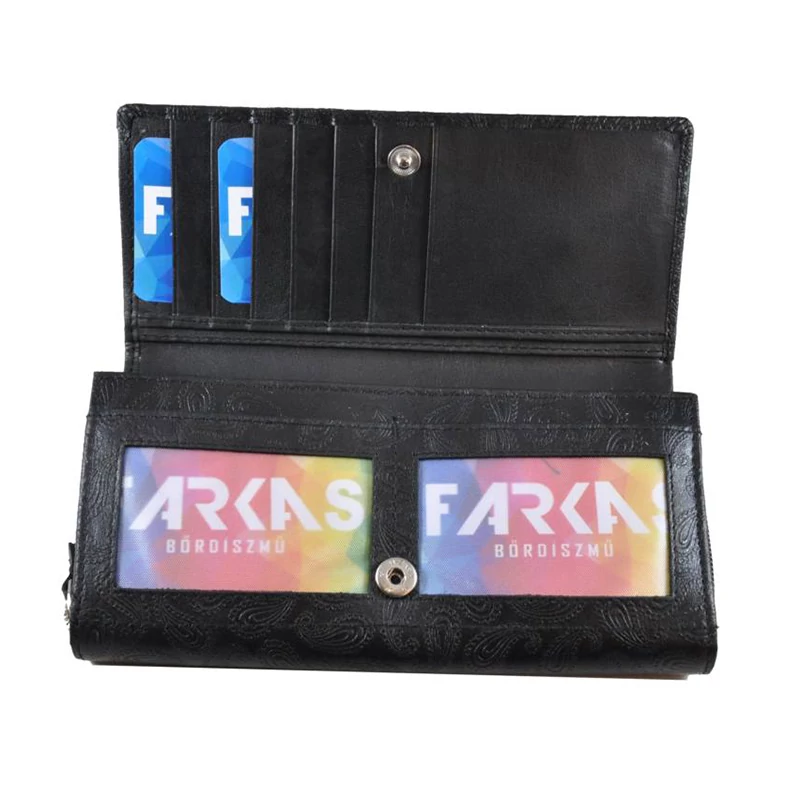 Farkas márkájú, nagy méretű női pénztárca, melyet különleges, nyomott csepp minta díszít. A termék kiváló minőségű bőrből készült. Fedele patenttal nyitható.Belsejének elrendezése igazán praktikus, minden igényt kielégít. 3 rekeszes papírpénztartóval, egy strapabíró körcipzárral nyíló, 2 rekeszes aprópénztartóval, összesen 12 kártyatartó hellyel (ebből 2 ablakos) és 2 nagyobb igazolványtartó hellyel rendelkezik. Díszdobozban kínáljuk vásárlóinknak ezt a gyönyörűen kivitelezett, igényes terméket.