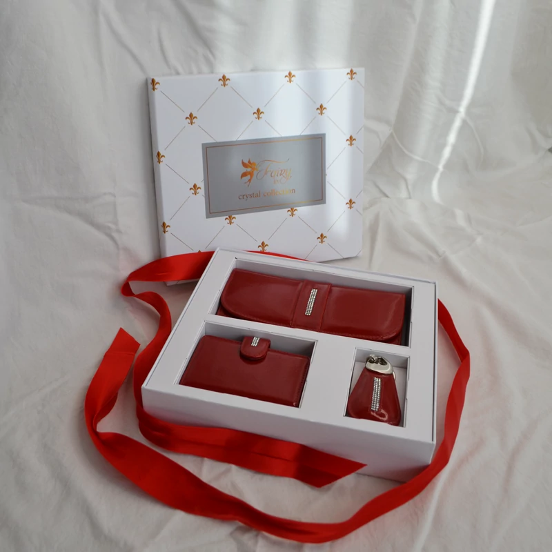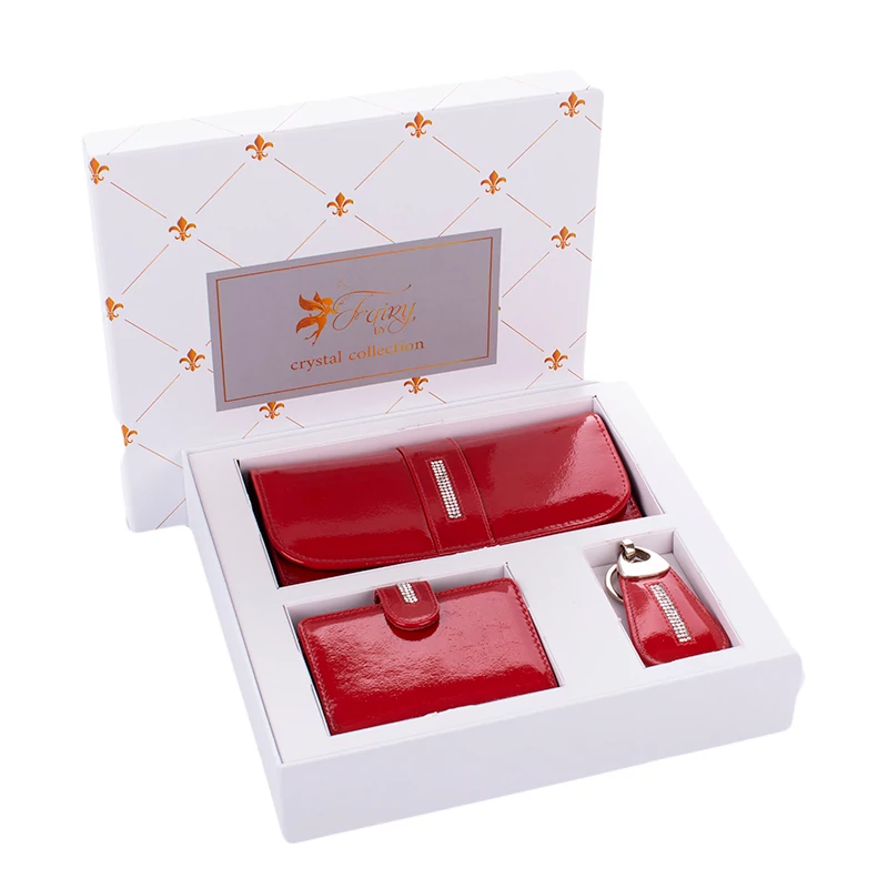 Három részes, exkluzív Fairy Crystal ajándékcsomag. Gyönyörű, elegáns szett nőknek tervezve. Az ajándékcsomag tartalma egy kristály kövekkel díszített valódi bőr nagyméretű női pénztárca, egy kártyatartó, valamint egy kulcstartó. Ideális ajándékötlet, ha valami igazán szép és időtálló ajándékot keresel szerettednek.