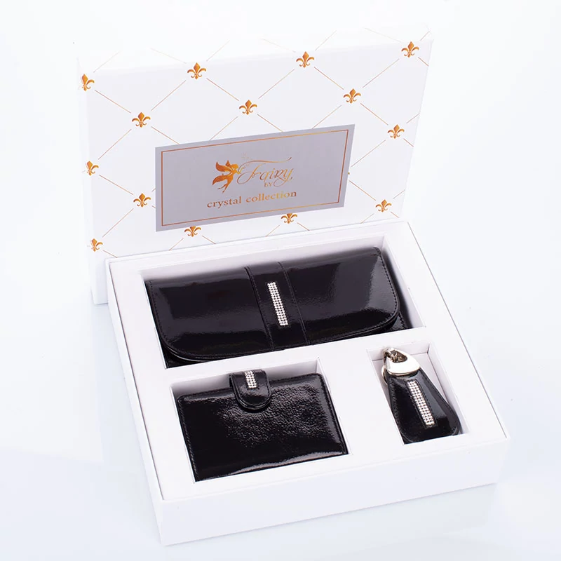 Három részes, exkluzív Fairy Crystal ajándékcsomag. Gyönyörű, elegáns szett nőknek tervezve. Az ajándékcsomag tartalma egy kristály kövekkel díszített valódi bőr nagyméretű női pénztárca, egy kártyatartó, valamint egy kulcstartó. Ideális ajándékötlet, ha valami igazán szép és időtálló ajándékot keresel szerettednek. Exluzív díszdobozban szállítjuk.
