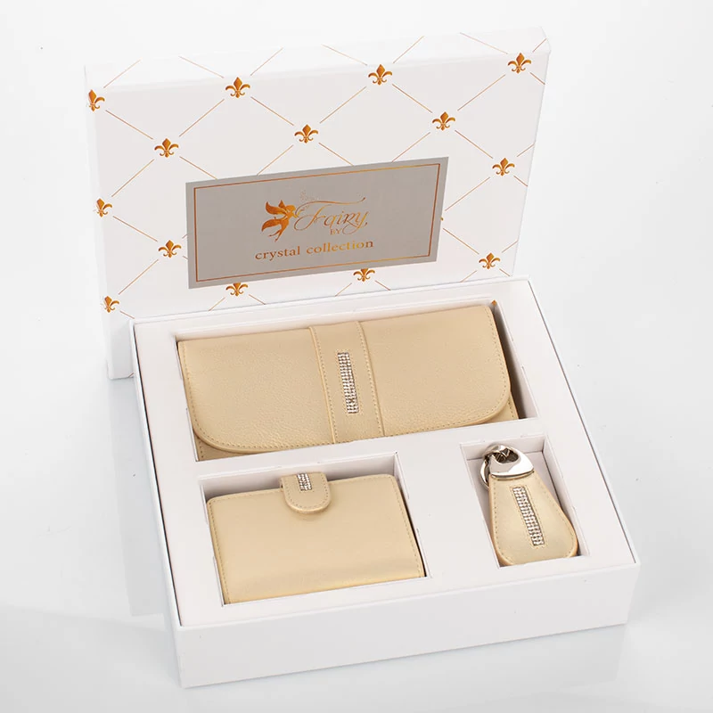Három részes, exkluzív Fairy Crystal ajándékcsomag. Gyönyörű, elegáns szett nőknek tervezve. Az ajándékcsomag tartalma egy kristály kövekkel díszített valódi bőr nagyméretű női pénztárca, egy kártyatartó, valamint egy kulcstartó. Ideális ajándékötlet, ha valami igazán szép és időtálló ajándékot keresel szerettednek. Exluzív díszdobozban szállítjuk.