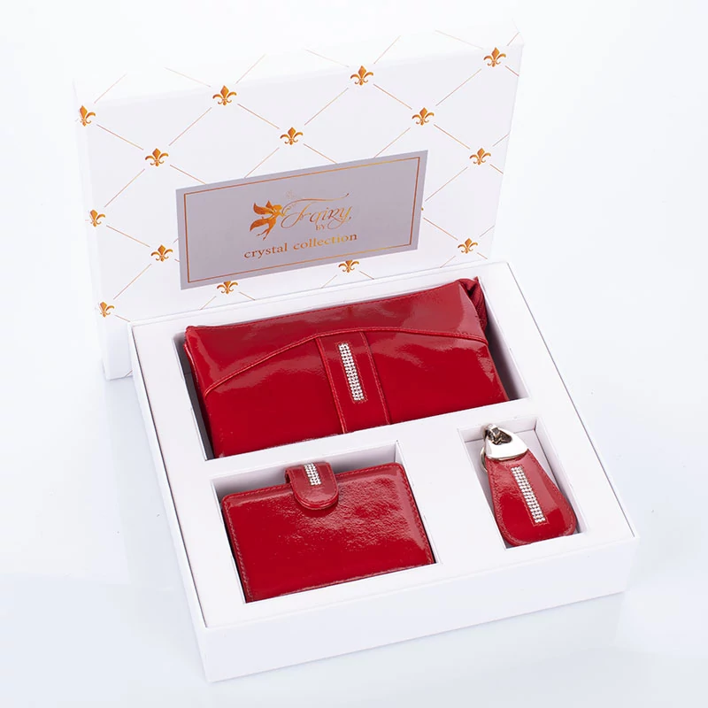 Három részes, exkluzív Fairy Crystal ajándékcsomag. Gyönyörű, elegáns szett nőknek tervezve. Az ajándékcsomag tartalma egy kristály kövekkel díszített valódi bőr nagyméretű női pénztárca, egy kártyatartó, valamint egy kulcstartó. Ideális ajándékötlet, ha valami igazán szép és időtálló ajándékot keresel szerettednek. Exluzív díszdobozban szállítjuk.