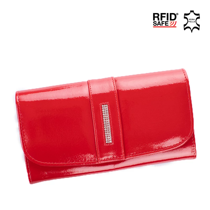 A nagy női bőr pénztárca mérete 9 x 19 cmTágas belső kialakításában öt papírpénz20 kártyaegy fénykép és egy cipzáras aprópénz tartó zsebe van. Könnyen rendszerezhető és akár még mobiltelefonunk is elfér benne. Igényes valódi bőr női pénztárcapiros színben, kristály kövekkel díszítve.