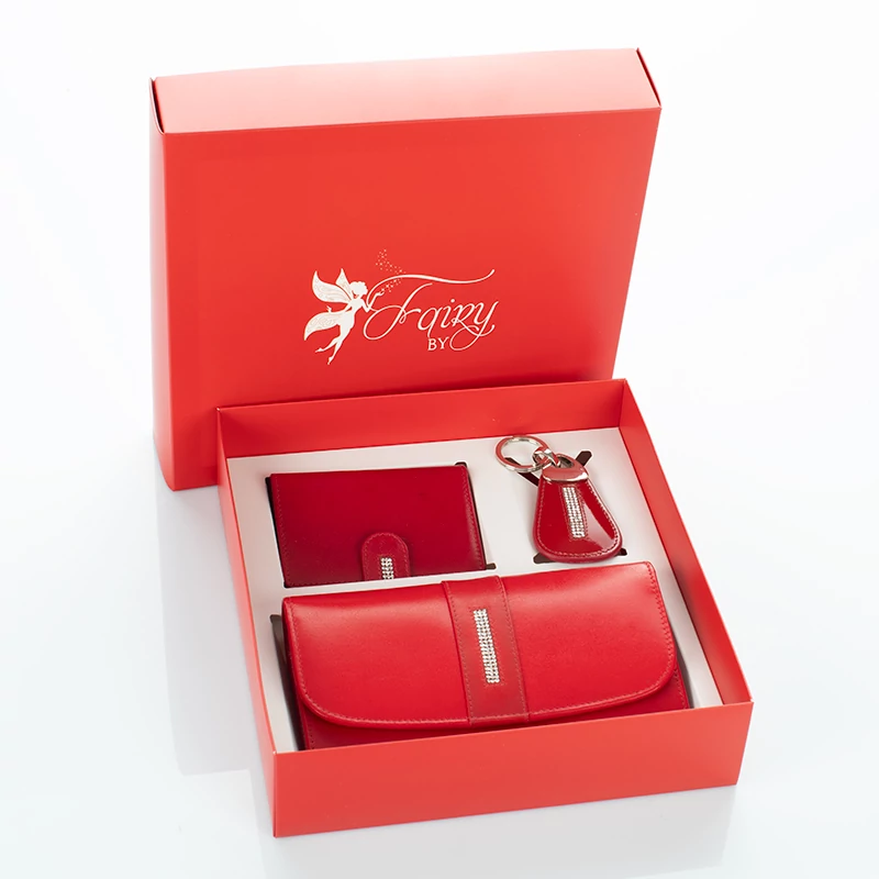 Három részes, exkluzív Fairy Crystal ajándékcsomag. Gyönyörű, elegáns szett nőknek tervezve. Az ajándékcsomag tartalma egy kristály kövekkel díszített valódi bőr nagyméretű női pénztárca, egy kártyatartó, valamint egy kulcstartó. Ideális ajándékötlet, ha valami igazán szép és időtálló ajándékot keresel szerettednek.