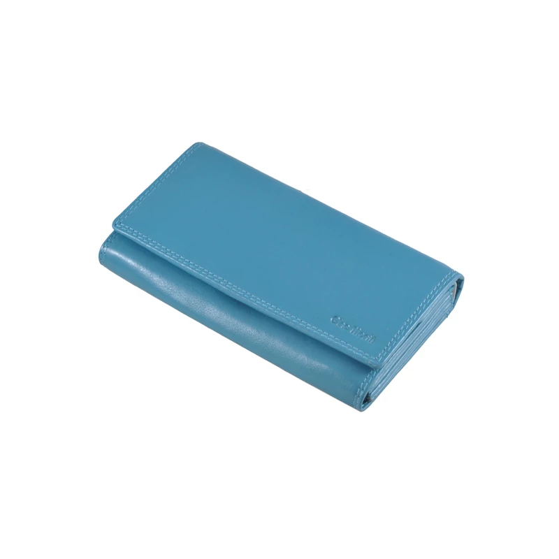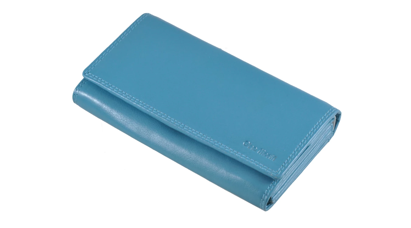 Nagy méretű női pénztárca, mely minőségi nappa bőrből készült. Fedele patenttal nyitható. Belsejében 5 rekeszes papírpénztartó, egy patenttal nyitható aprópénztartó rész, 6 db kártyatartó, egy igazolványtartó és egy cipzáras zseb található. A pénztárca hátulján egy további kis zseb el van helyezve..