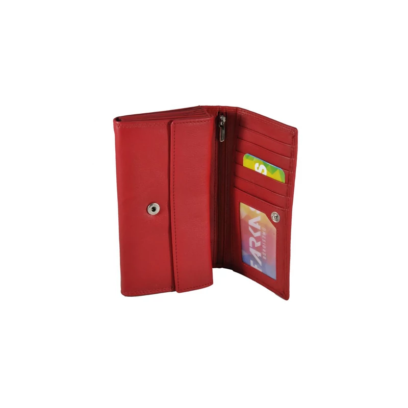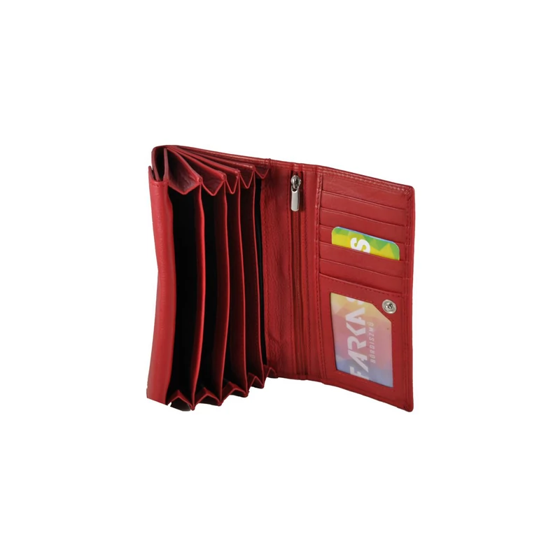 Nagy méretű női pénztárca, mely minőségi nappa bőrből készült. Fedele patenttal nyitható. Belsejében 5 rekeszes papírpénztartó, egy patenttal nyitható aprópénztartó rész, 6 db kártyatartó, egy igazolványtartó és egy cipzáras zseb található. A pénztárca hátulján egy további kis zseb el van helyezve..