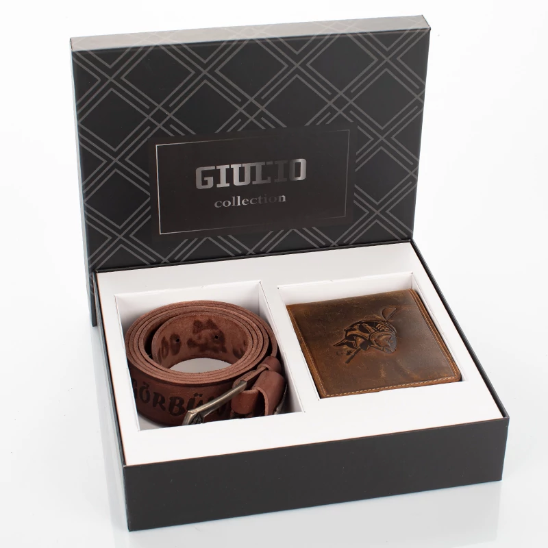 Tökéletes GIULIO pénztárca-öv szett ajándékcsomag férfiaknak. Ez az ajándékcsomag nem csak remek minőségű, de nagyon hasznos is! Hiszen a bőr férfi övek és a bőr férfi pénztárcák azok a kellékek, amiket egy férfi szinte mindennap használ, ezért lehetetlen, hogy pár év után ne használódjanak el. Ezért, ezzel az ajándékdobozzal nem lehet mellé lőni! A GIULIO Collection ajándékdoboz tartalma, egy barna bivalybőr férfi pénztárca, horgász mintával, aminek a mérete 9,5 x 12 cm, és egy barna valódi bőr férfi öv. Az ajándékdoboz pedig magas minőségű vastag papírból készült, amit az ajándékozás után nem szükséges automatikusan kidobni. Vegye ki a belső elválasztót és használja fel tárolásra, vagy tárgyai rendszerezésére!