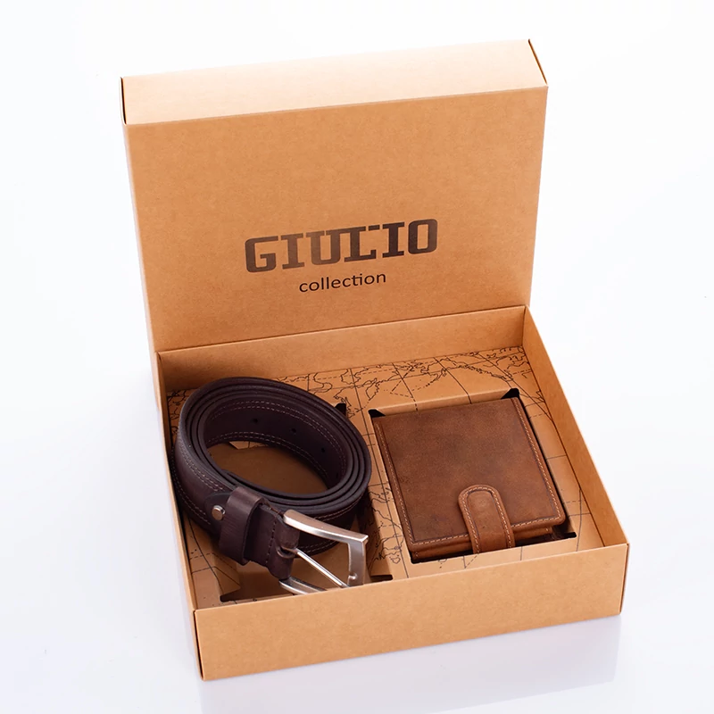 Tökéletes GIULIO pénztárca-öv szett ajándékcsomag férfiaknak. Ez az ajándékcsomag nem csak remek minőségű, de nagyon hasznos is! Hiszen a bőr férfi övek és a bőr férfi pénztárcák azok a kellékek, amiket egy férfi szinte mindennap használ, ezért lehetetlen, hogy pár év után ne használódjanak el. Ezért, ezzel az ajándékdobozzal nem lehet mellé lőni! A GIULIO Collection ajándékdoboz tartalma, egy bőr férfi pénztárca, aminek a mérete 9,5 x 12 cm, és egy  valódi bőr férfi öv. Az ajándékdoboz pedig magas minőségű vastag papírból készült, amit az ajándékozás után nem szükséges automatikusan kidobni. Vegye ki a belső elválasztót és használja fel tárolásra, vagy tárgyai rendszerezésére!