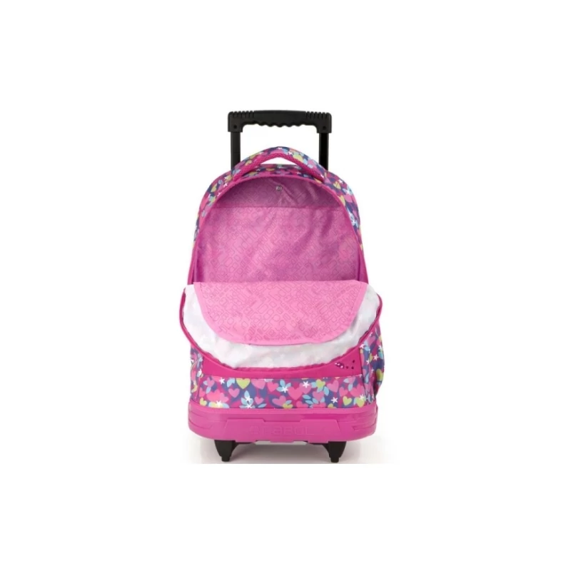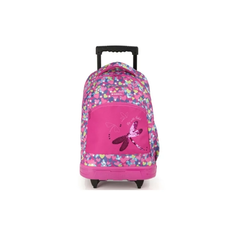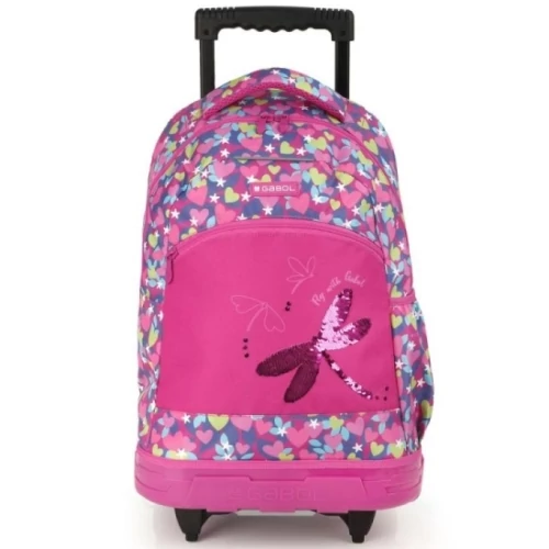Gabol Wings gurulós hátizsák. Kézben, háton, és az állítható húzókarnál fogva magunk után húzva egyaránt hordható. A hátizsák 1 főrekesszel, valamint 1 elülső és 1 oldalsó mellékrekesszel bír. A főrekesz rendkívül tágas, így a tanszerek kényelmesen elférnek benne. A táska oldalsó zsebe italos flakon tárolására kiválóan alkalmas. A hátizsák cipzárjai kivétel nélkül jó minőségűek, a cipzárkocsi könnyedén siklik.