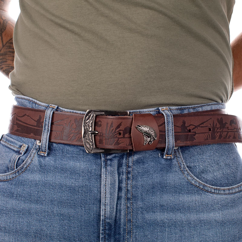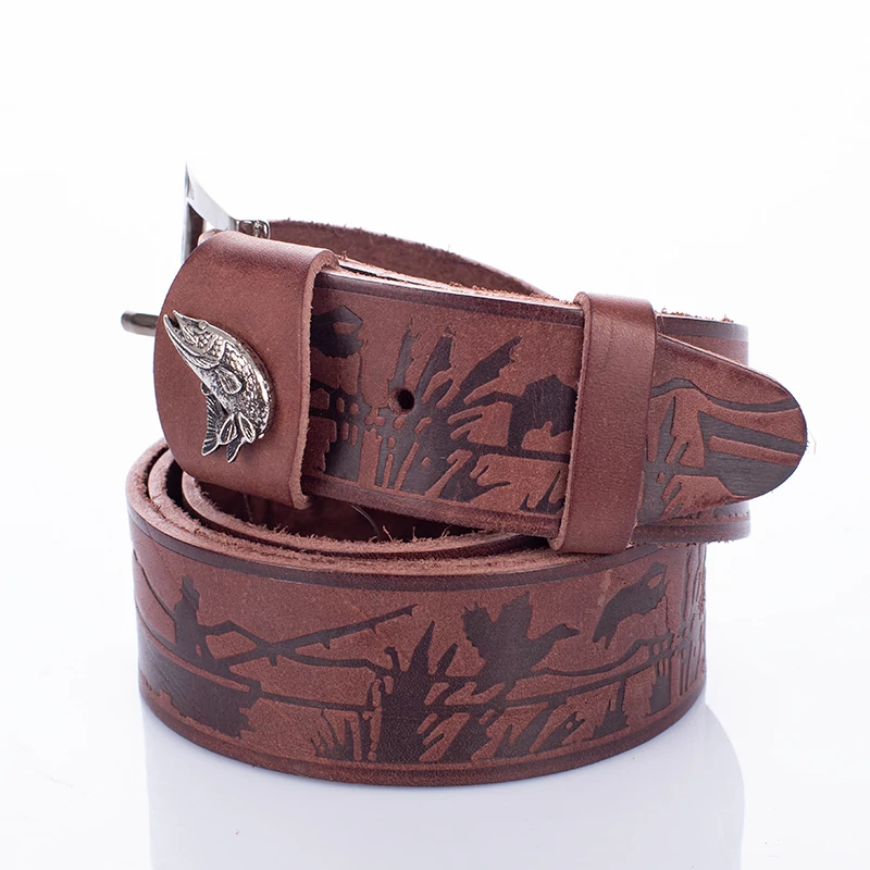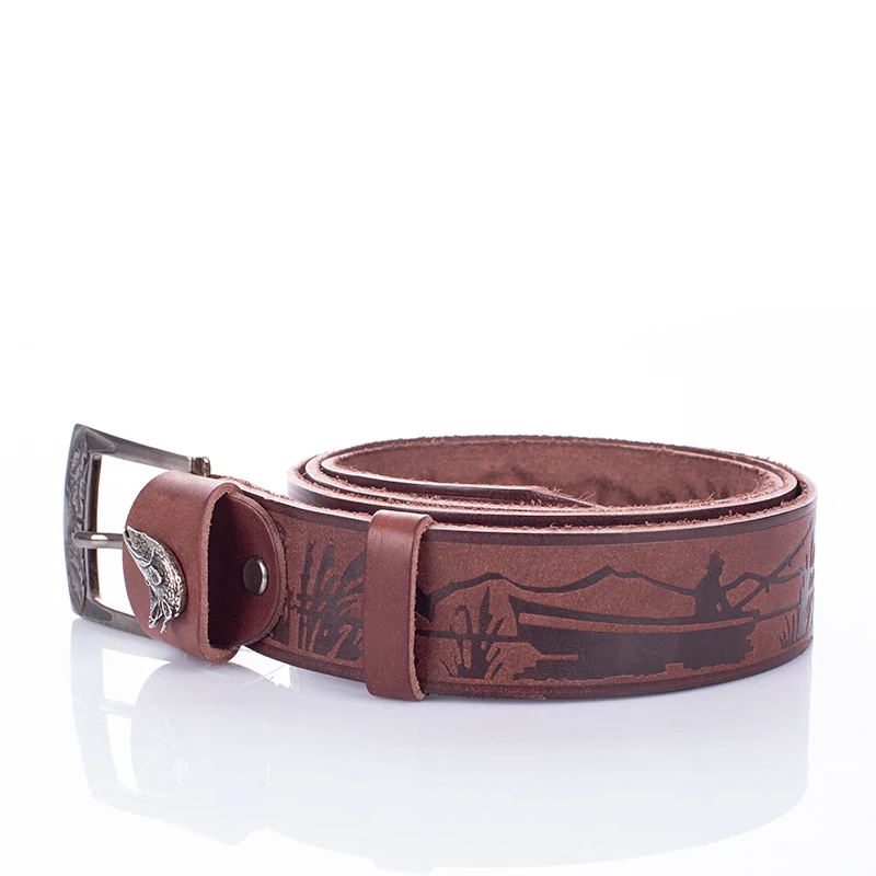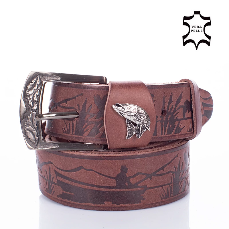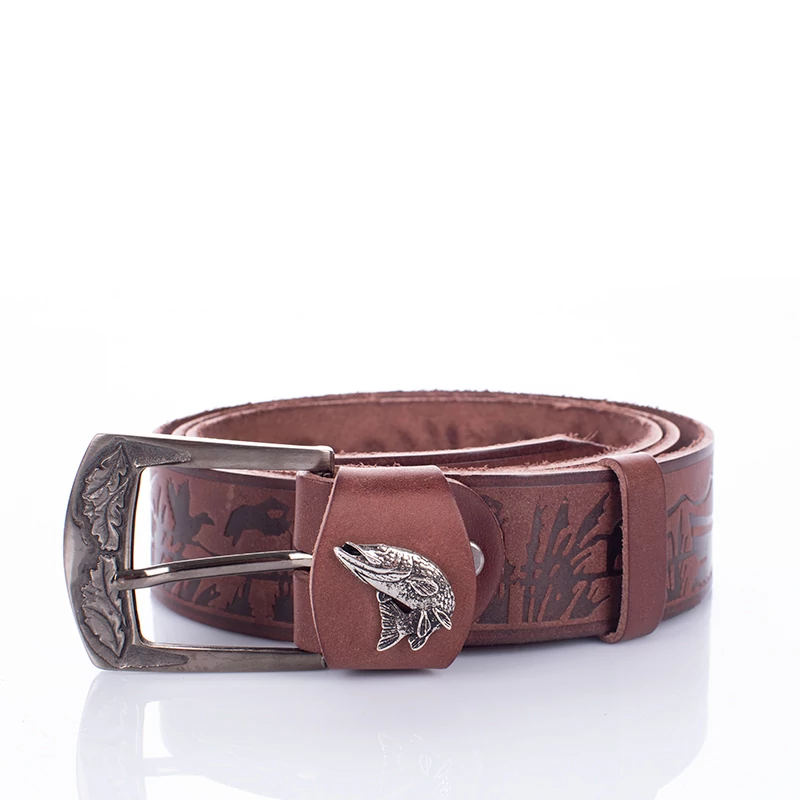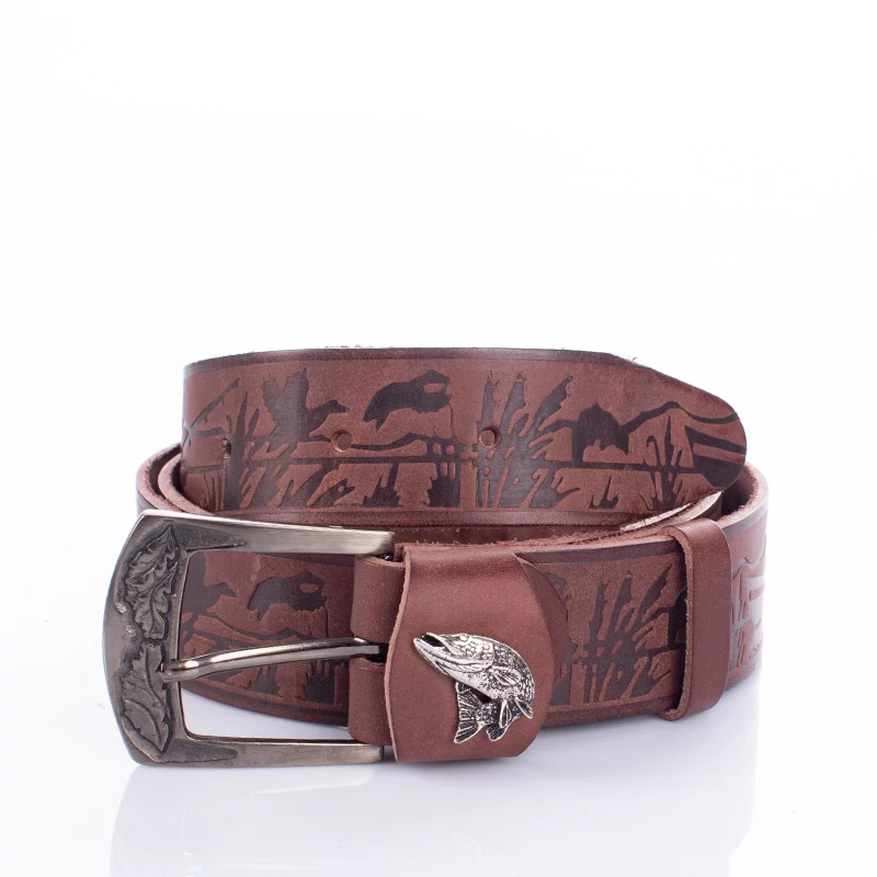 Süllő mintával ellátott horgász barna színű férfi öv. Kiváló választás lehet mindenki számára aki szeret horgászni, és kedveli a minőségi darabokat. Hiszen ez a férfi nadrágszíj magas minőségű, masszív marhabőrből, egyedi mintával készült, magyar kézműves termék. Anyagának köszönhetően ez a férfi bőr öv strapabíró, és erős tartást biztosít az egész nap folyamán. Nem utolsó sorban pedig, farmernadrággal is kényelmesen hordható. Az öv 7 méretben kapható, és méretre szabható, szélessége pedig 4 cm. Ajándékba is remek választás lehet horgász ismerősünknek, így díszdobozzal együtt is elérhető ez a nadrág öv.