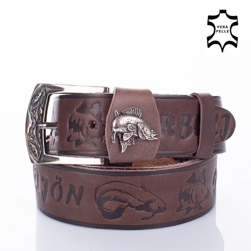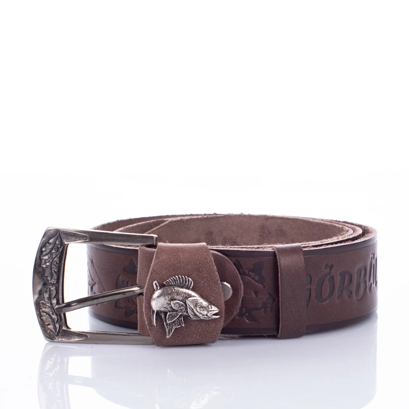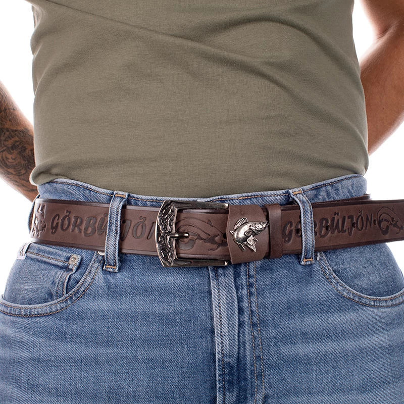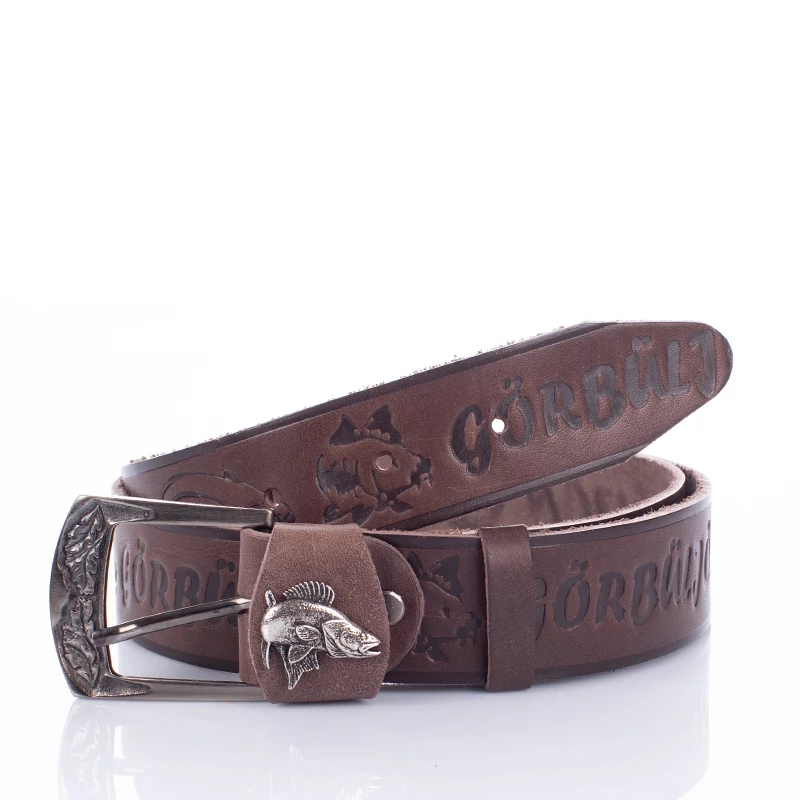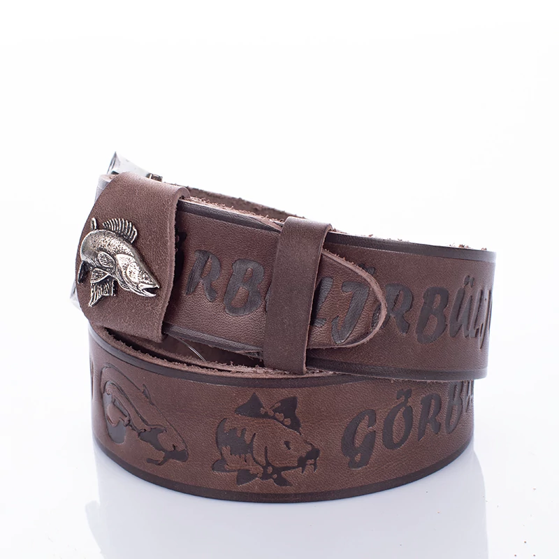 Süllő mintával és ‘görbüljön’ felirattal ellátott horgász barna színű férfi öv. Kiváló választás lehet mindenki számára aki szeret horgászni, és kedveli a minőségi darabokat. Hiszen ez a férfi nadrágszíj magas minőségű, masszív marhabőrből, egyedi mintával készült, magyar kézműves termék. Anyagának köszönhetően ez a férfi bőr öv strapabíró, és erős tartást biztosít az egész nap folyamán. Nem utolsó sorban pedig, farmernadrággal is kényelmesen hordható. Az öv 7 méretben kapható, és méretre szabható, szélessége pedig 4 cm. Ajándékba is remek választás lehet horgász ismerősünknek, így díszdobozzal együtt is elérhető ez a nadrág öv.