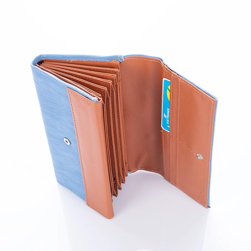 Praktikus, jól pakolható belsővel készült, melyben egy hatrészes papírpénztartó,patentos aprópénztartó, 4db kártyatartó és irattartó is található.