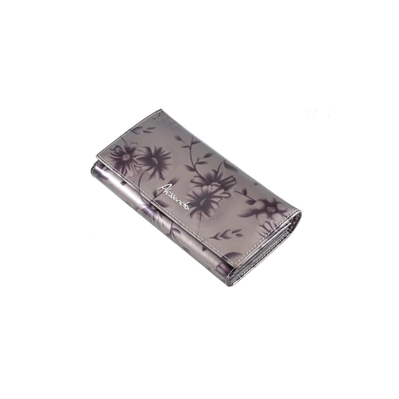 Stílusos lakkpénztárca az Alessandro Paoli termékcsaládból. Külseje lakkbőrből, belseje valód bőrből készült. Gyönyörű virág mintázat díszíti a lakkos felületet. Fedele patenttal nyitható. Belseje minimalista, praktikus elrendezésű: 3 rekeszes papírpénztartóval, 1 patenttal és 1 cipzárral nyíló aprópénztartóval, 2 igazolványtartó hellyel, 7 db kártyatartó és 2 db igazolványtartó rekesszel rendelkezik (abból egy "ablakos"). . A termék RFID védelemmel ellátott!
