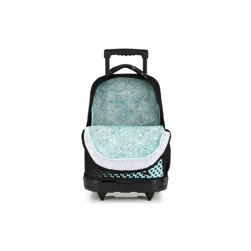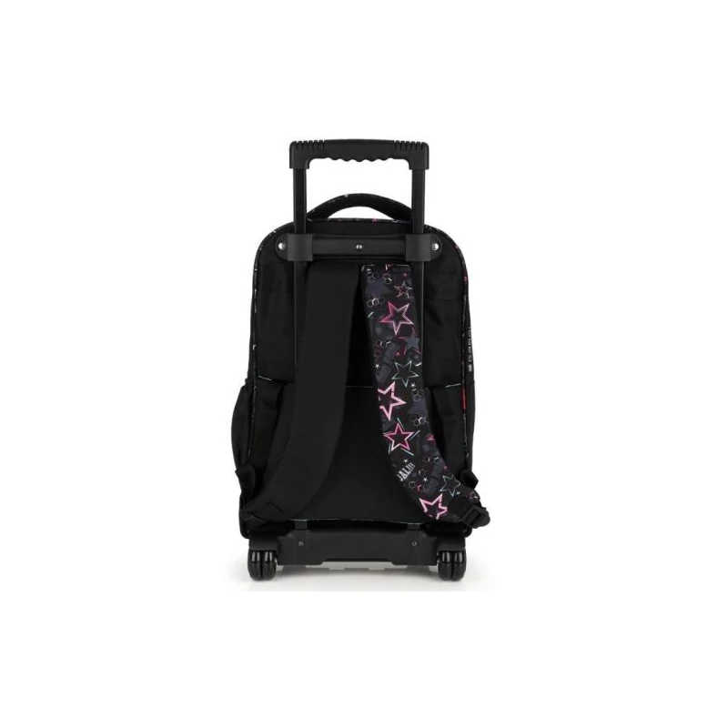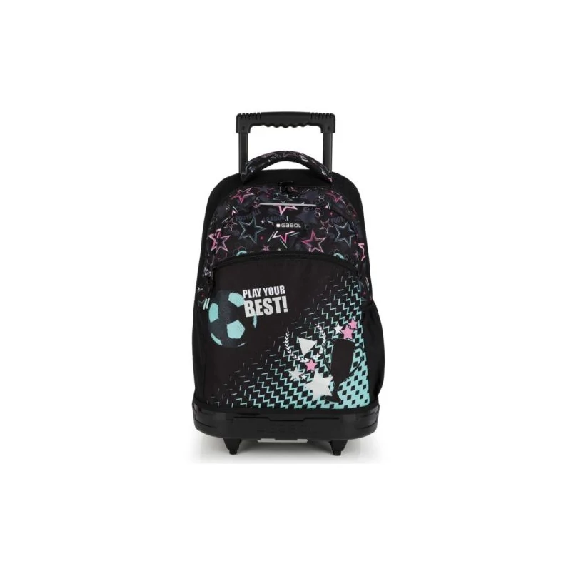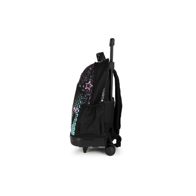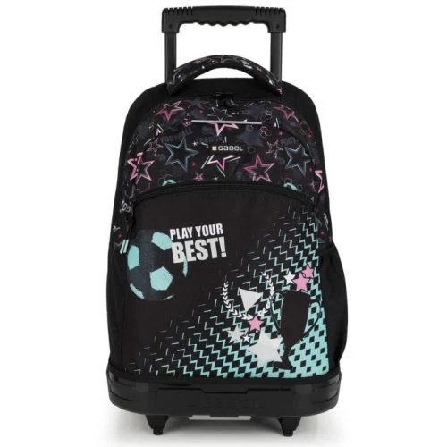 Gabol Stellar gurulós hátizsák. Kézben, háton, és az állítható húzókarnál fogva magunk után húzva egyaránt hordható. A hátizsák 1 főrekesszel, valamint 1 elülső és 1 oldalsó mellékrekesszel bír. A főrekesz rendkívül tágas, így a tanszerek kényelmesen elférnek benne. A táska oldalsó zsebe italos flakon tárolására kiválóan alkalmas. A hátizsák cipzárjai kivétel nélkül jó minőségűek, a cipzárkocsi könnyedén siklik. Anyaga vízlepergető réteggel van bevonva.