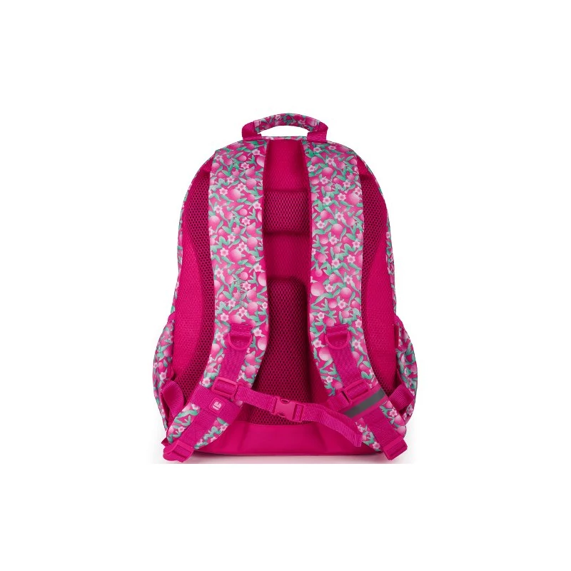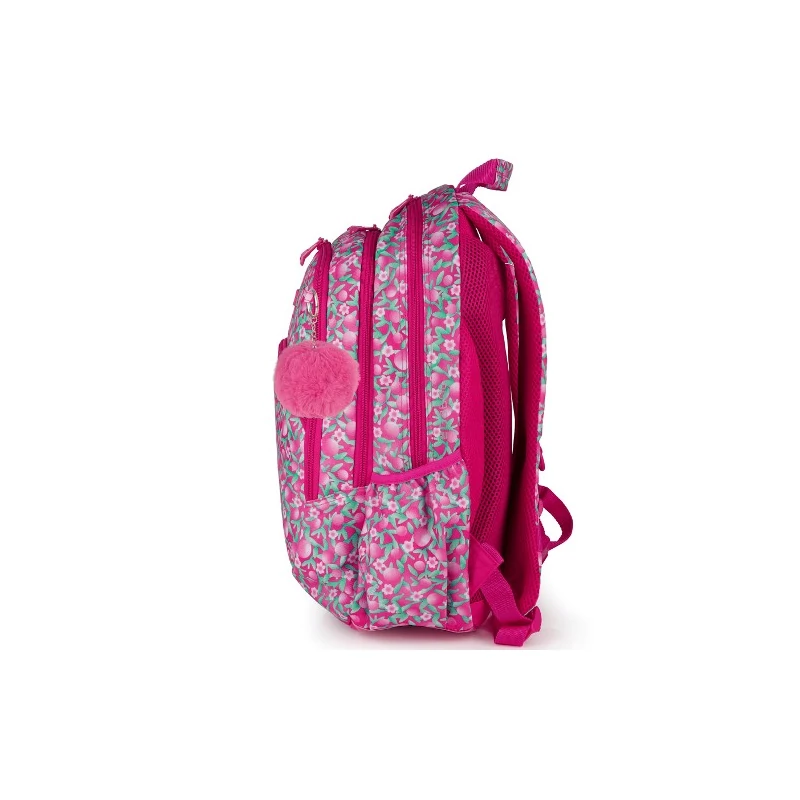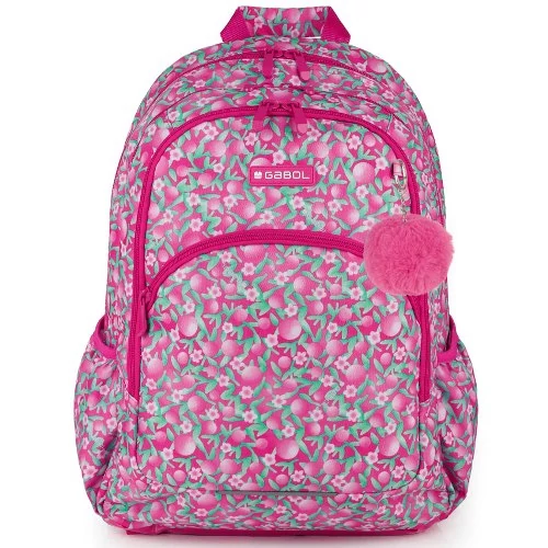 Gabol Cherry hátizsák. Kézben, és állítható, szivacsos vállpántjainak, valamint szintén szivacsos (ergonómikus) hátrészének köszönhetően háton egyaránt kényelmesen hordható. A hátizsák két fő-, két elülső mellék-, és két oldalsó rekesszel rendelkezik. Nagyobbik főrekeszében egy mappák tárolására alkalmas zseb, elülső főrekeszében egy cipzáras zseb, rajta névcímkével, míg kisebbik elülső mellékrekeszében két kisebb névjegytartó található. A hátizsák alját speciális vízálló anyaggal vonták be, mely véd a koszolódástól, illetőleg gyors tisztítást tesz lehetővé.