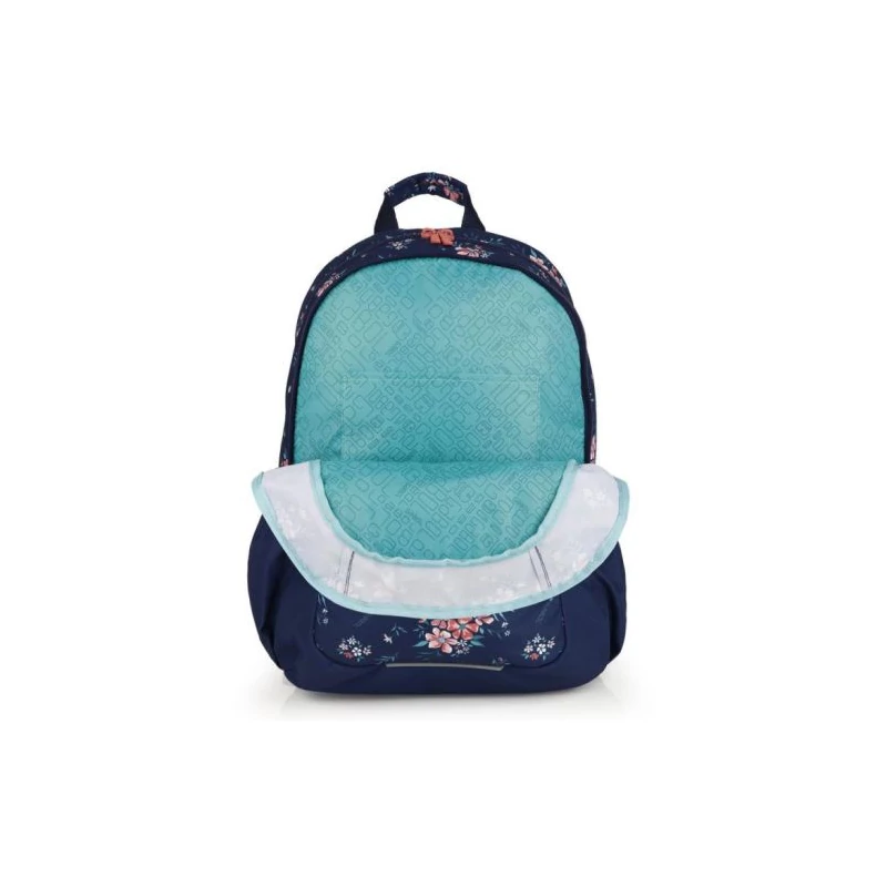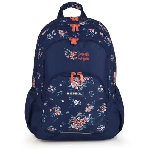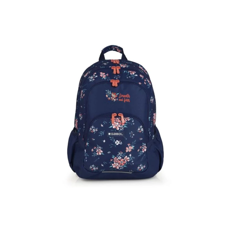 Gabol Melissa hátizsák. Kézben, és állítható, szivacsos vállpántjainak, valamint szintén szivacsos (ergonomikus) hátrészének köszönhetően háton egyaránt kényelmesen hordható. A hátizsák két fő-, két elülső mellék-, és két oldalsó rekesszel rendelkezik. Nagyobbik főrekeszében találjuk a névcímkét és egy mappák tárolására alkalmas zsebet, másik főrekeszében pedig egy kisebb zseb kapott helyet. A két elülső mellékrekesz remek hely egyéb iskolai dolgaink, valamint személyes tárgyaink tárolására. Két oldalsó rekesze, a gumírozott zsebeknek köszönhetően lehetőséget kínálnak egy-egy kisebb palack tárolására.