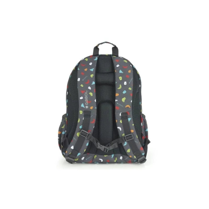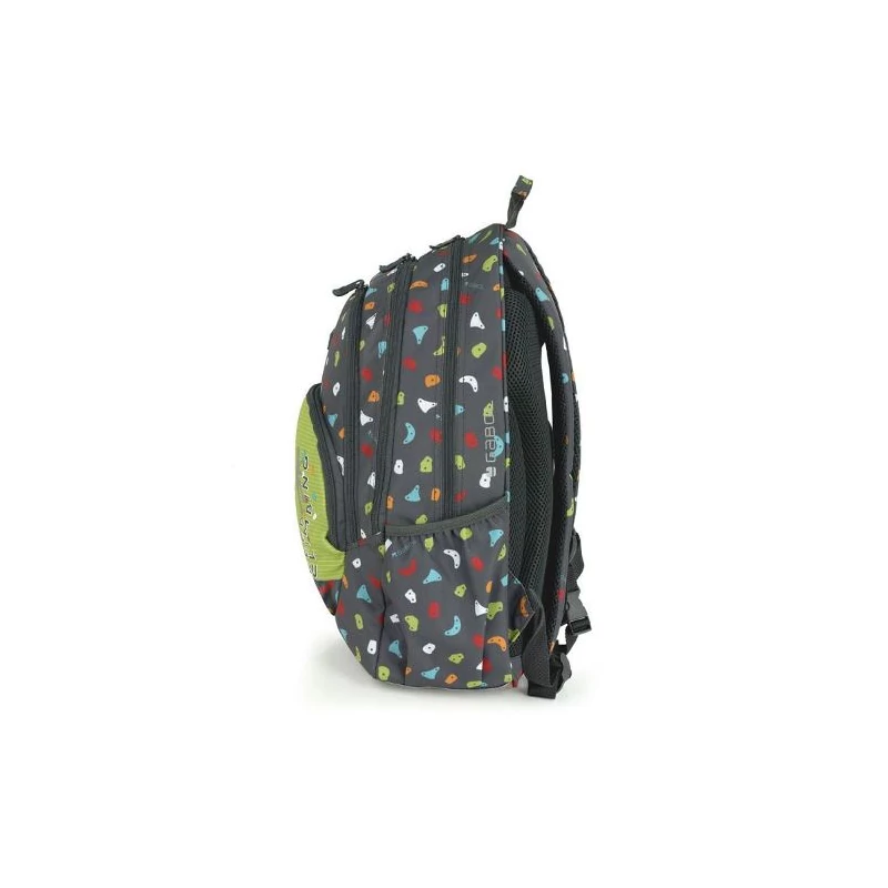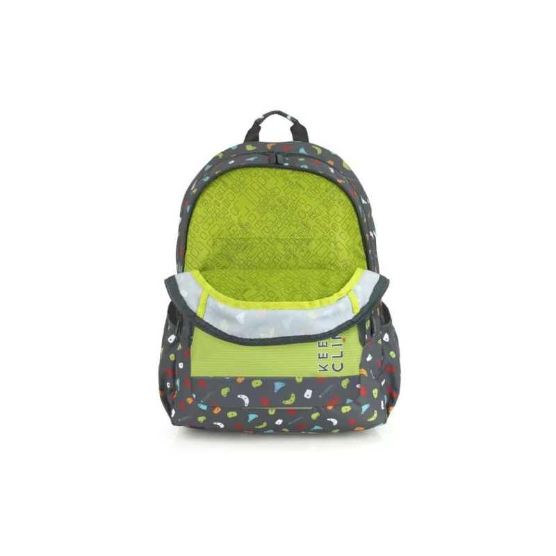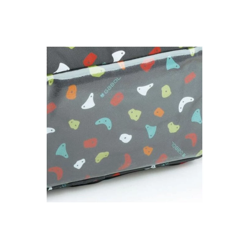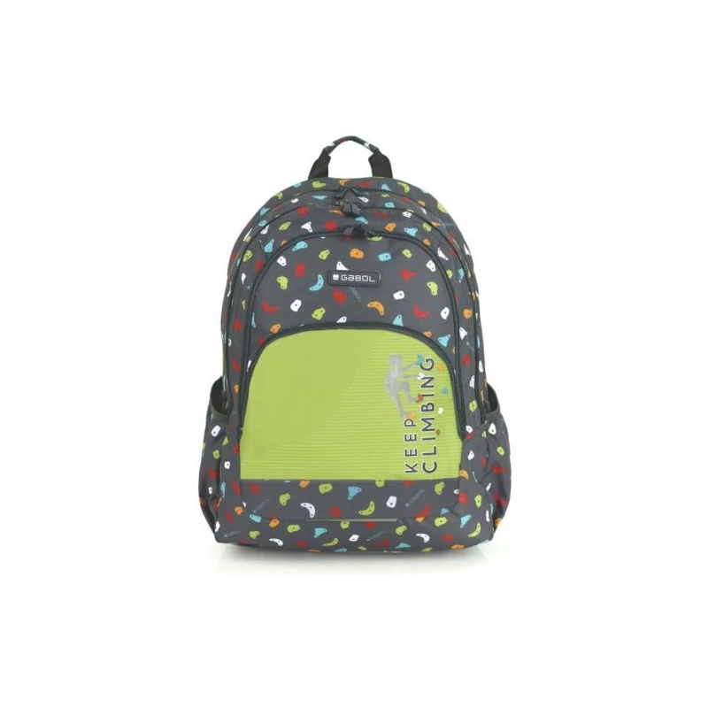 Gabol Climb hátizsák. Kézben, és állítható, szivacsos vállpántjainak, valamint szintén szivacsos (ergonomikus) hátrészének köszönhetően háton egyaránt kényelmesen hordható. A hátizsák két fő-, két elülső mellék-, és két oldalsó rekesszel rendelkezik. Nagyobbik főrekeszében találjuk a névcímkét és egy mappák tárolására alkalmas zsebet, másik főrekeszében pedig egy kisebb zseb kapott helyet. A két elülső mellékrekesz remek hely egyéb iskolai dolgaink, valamint személyes tárgyaink tárolására. Két oldalsó rekesze, a gumírozott zsebeknek köszönhetően lehetőséget kínálnak egy-egy kisebb palack tárolására.