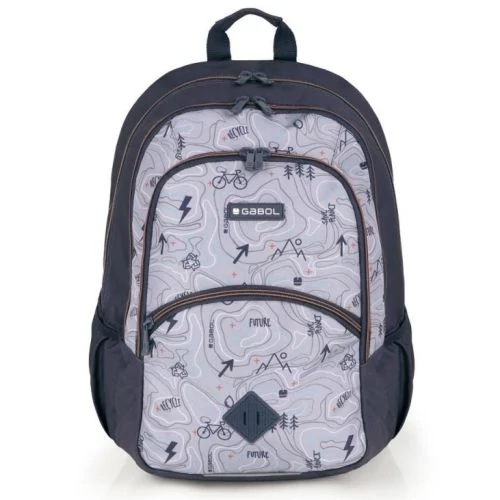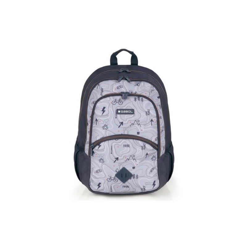 Gabol Earth hátizsák. Kézben, és állítható, szivacsos vállpántjainak, valamint szintén szivacsos (ergonomikus) hátrészének köszönhetően háton egyaránt kényelmesen hordható. A hátizsák két fő-, két elülső mellék-, és két oldalsó rekesszel rendelkezik. Nagyobbik főrekeszében találjuk a névcímkét és egy mappák tárolására alkalmas zsebet, másik főrekeszében pedig egy kisebb zseb kapott helyet. A két elülső mellékrekesz remek hely egyéb iskolai dolgaink, valamint személyes tárgyaink tárolására. Két oldalsó rekesze, a gumírozott zsebeknek köszönhetően lehetőséget kínálnak egy-egy kisebb palack tárolására.