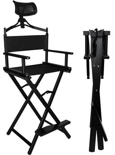 Összecsukható sminkszék fejtámlával - Rendkívül erős és kényelmes székünk a sminkeléshez, fodrászathoz, rendezői székként is kiválóan működik. Fekete alumíniumból készült. Az ülés vízálló Oxford 600D anyagból készült. Ezen kívül a széket kényelmes fejtámlával láttuk el, ami tovább növeli a kényelmet a hosszú munkamenetek során. A termék 140 kg-os teherbírással rendelkezik ! Az alján lévő lábak stabilan tartják és garantálják a biztonságot a használat során.