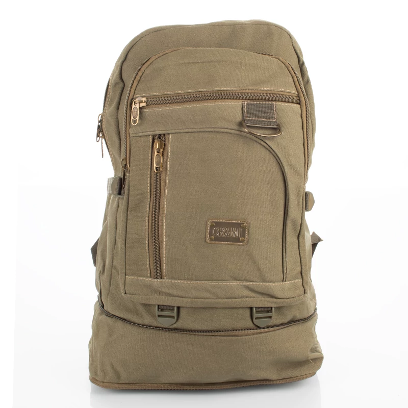 Nagyméretű hátizsák erős vászon anyagból, praktikus tárolórészekkel, sok zsebbel.