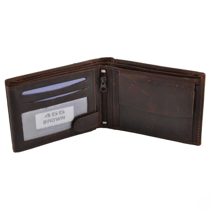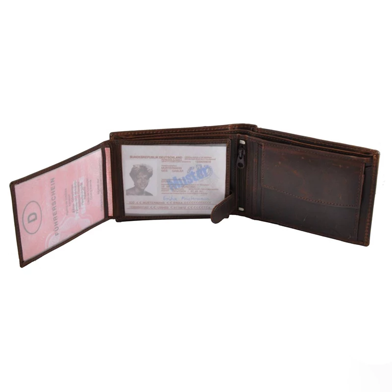 Férfi pénztárca kedvelt fazonban, kellemes tapintású, minőségi bőrből. Belsejének elrendezése hagyományos, praktikus. Két rekeszes papírpénztartó, egy cipzáras zseb, kettő igazolványtartó hely, egy patenttal nyíló aprópénztartó és egy könyvszerűen lapozható kártyatartó rész található meg benne. Összesen 10 kártyának van itt hely, abból 3 "ablakos". A pénztárca hátulján egy további igazolvány tartó zseb van elhelyezve.