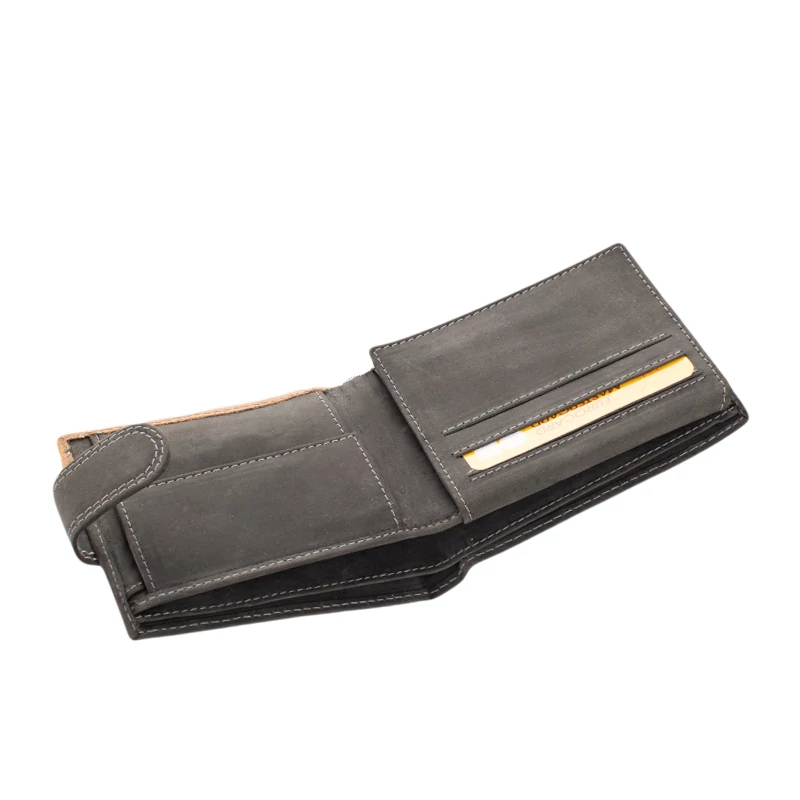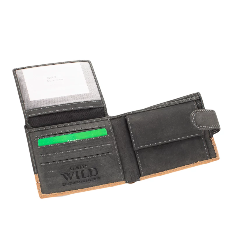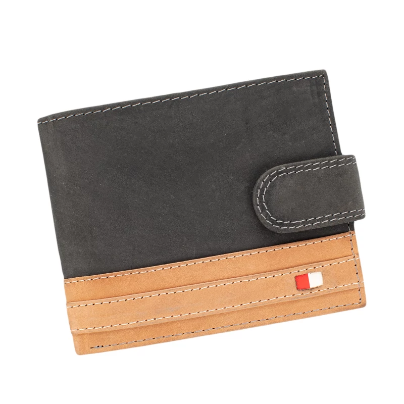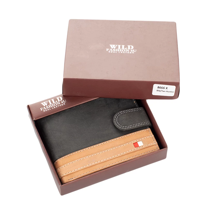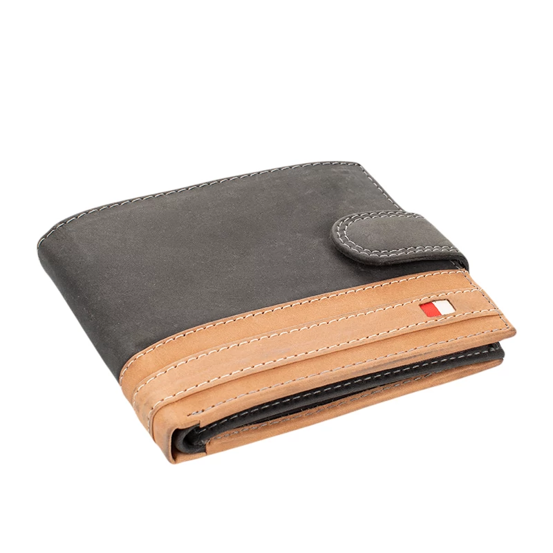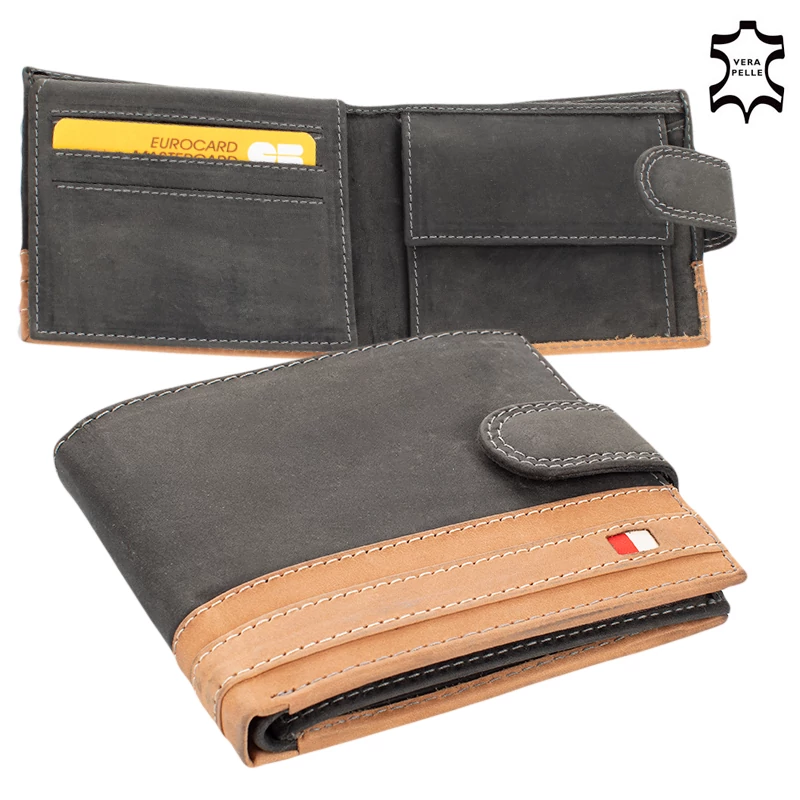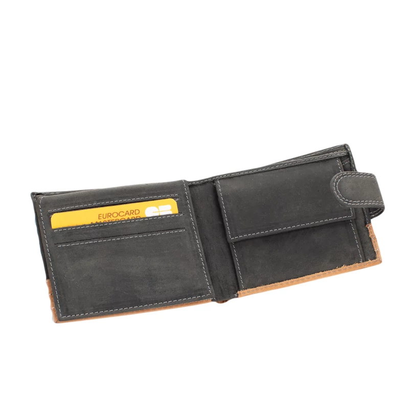 Férfi pénztárca kiváló minőségű, koptatott "hunter" bőrből. Felső része fekete, alul pedig barna csíkozás és egy piros-fehér elem dobja fel. Fedele patentos átkapcsolóval nyitható. Két rekeszes papírpénztartóval, egy patenttal nyíló aprópénztartóval és összesen 8 kártyatartó hellyel rendelkezik, ebből 1 "ablakos"; a kártyatartó része felfele hajtható.