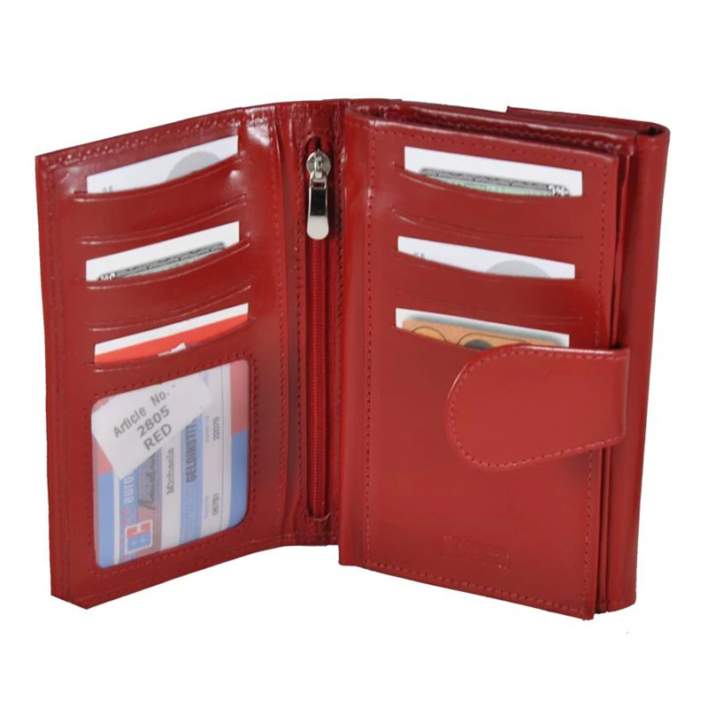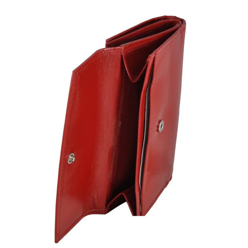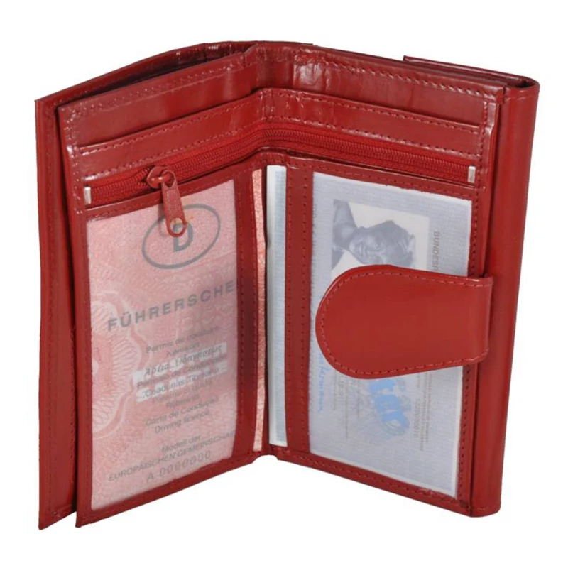 Kiváló minőségű bőrből készült álló fazonú női pénztárca sok kártya- és igazolványtartó hellyel. Elejét egy nagy átkacsoló fülecske, hátulját pedig egy díszvarrás díszíti. Fedele patenttal nyitható. Belsejében két rekeszes papírpénztartó, 2 ablakos igazolványtartó és  egy cipzáras zseb található. Mögött el van helyezve egy lapozható kártyatartó rész további 2 igazolványtartó hellyel és egy további cipzáras zsebbel. 10 db kártya elfér ide. A pénztárca hátulján patenttal nyílik az aprópénz tartó; itt még egy igazolványtartó helyet találunk. Díszdobozban szállítjuk ezt a divatos tárcát.