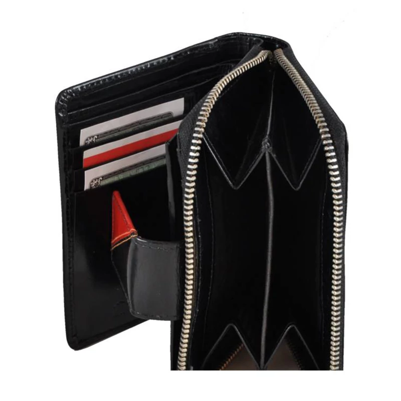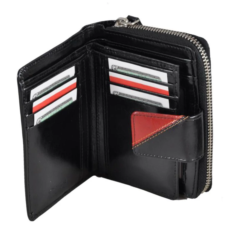 A tárca egy patentos átkapcsoló fülecskével nyílik, amelyet egy színes díszelem díszíti. Belül lapozható kártyatartó rész található. A papírpénztartó egy rekeszes, összesen 11 db kártyatartó hellyel és 8 igazolványtartó hellyel rendelkezik. A pénztárca hátulján körcipzárral nyílik a két rekeszes aprópénztartó.