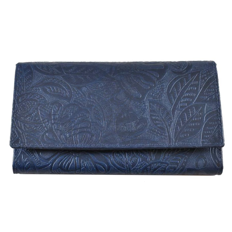 Nagy méretű női pénztárca, mely minőségi bőrből készült. Nyomott virágminta teszi különlegessé. Fedele patenttal nyitható. Belsejében 5 rekeszes papírpénztartó, egy patenttal nyitható aprópénztartó rész, 6 db kártyatartó, egy igazolványtartó és egy cipzáras zseb található. A pénztárcát igényes díszdobozban kínáljuk.