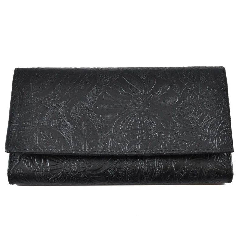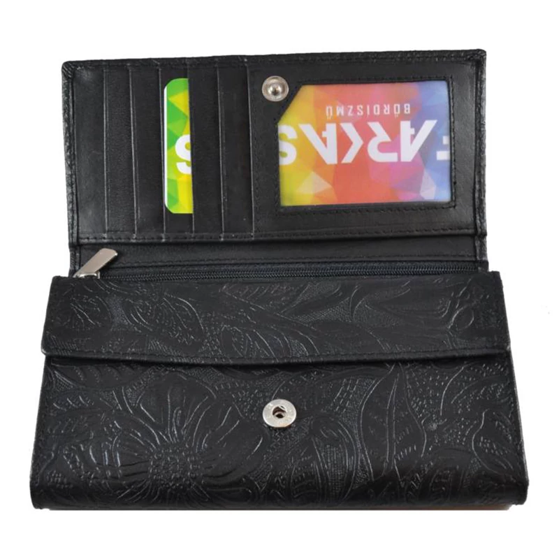 Nagy méretű női pénztárca, mely minőségi bőrből készült. Nyomott virágminta teszi különlegessé. Fedele patenttal nyitható. Belsejében 5 rekeszes papírpénztartó, egy patenttal nyitható aprópénztartó rész, 6 db kártyatartó, egy igazolványtartó és egy cipzáras zseb található. A pénztárcát igényes díszdobozban kínáljuk.