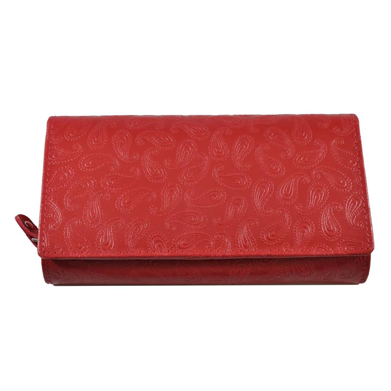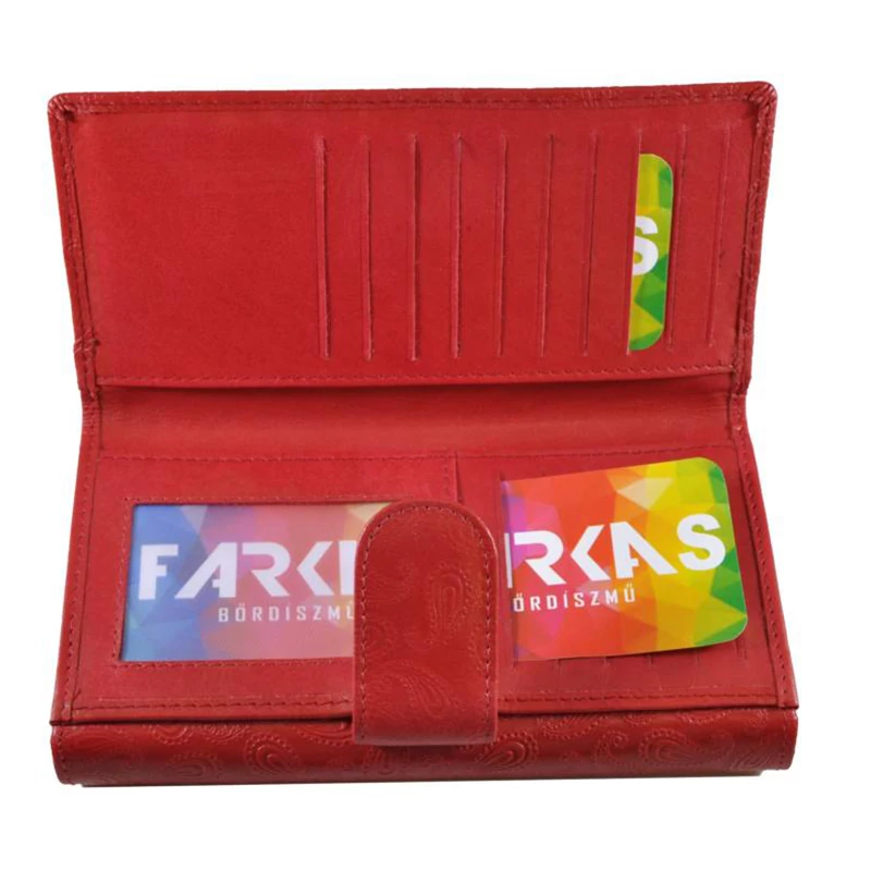 Nagy méretű női pénztárca, mely kiváló minőségű bőrből, különleges nyomott mintával készült. Saját termékünk, így szeretettel ajánljuk azoknak a Vásárlóinknak, akik szeretik a minőséget és az egyediséget. A pénztárcához igényes díszdoboz is jár. A fedele patenttal nyitható. Belsejének elrendezése klasszikus: egy 2 rekeszes papírpénztartóval, egy körcipzárral nyíló, 2 rekeszes aprópénztartóval, 2 igazolványtartó zsebbel és 7 db kártyatartó hellyel rendelkezik, ezek közül az egyik "ablakos". A pénztárca hátulja egy átkapcsoló fülecskével nyitható, itt további kártyatartó helyek vannak, összesen 17 kártyának és 2 (nagyobb) igazolványtartónak.