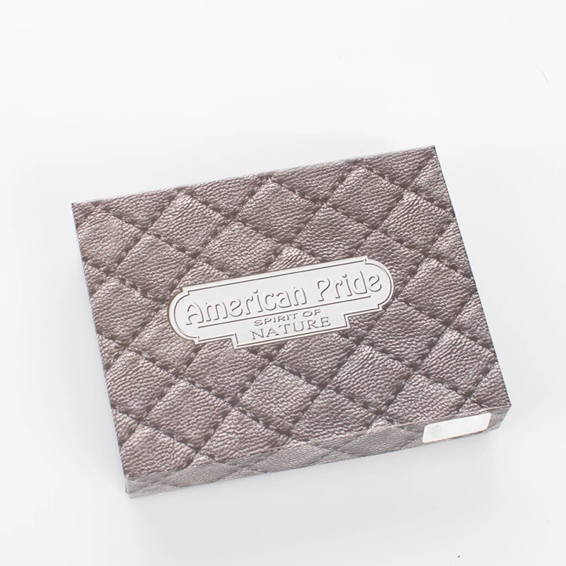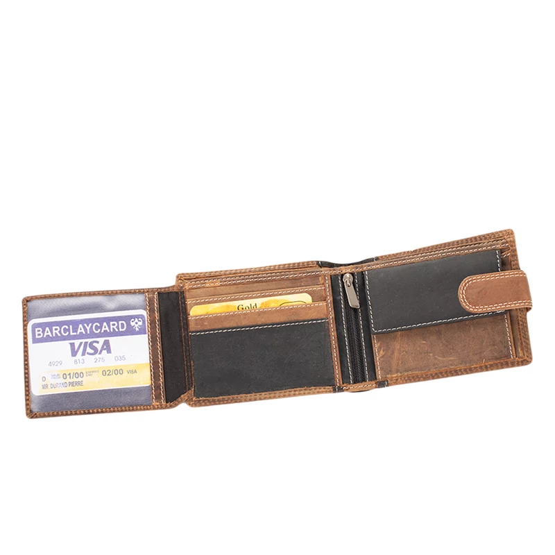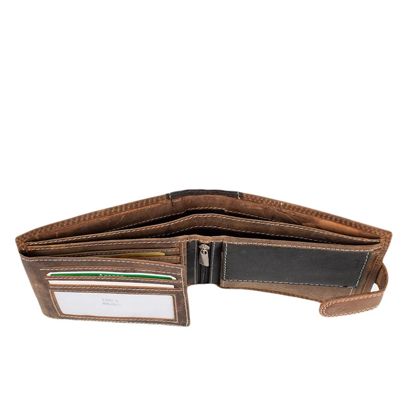 Hunter bőrből készült, minőségi, sportos bőrpénztárca. Belsejében két rekeszes papírpénztartó, egy patenttal nyíló aprópénztartó, egy igazolványtartó hely, egy cipzáras zseb és egy lapozható, kifele nyíló kártyatartó rész található. 7 kártyának van benne hely (abból 2 ablakos hely). Szürke díszdobozban szállítjuk.