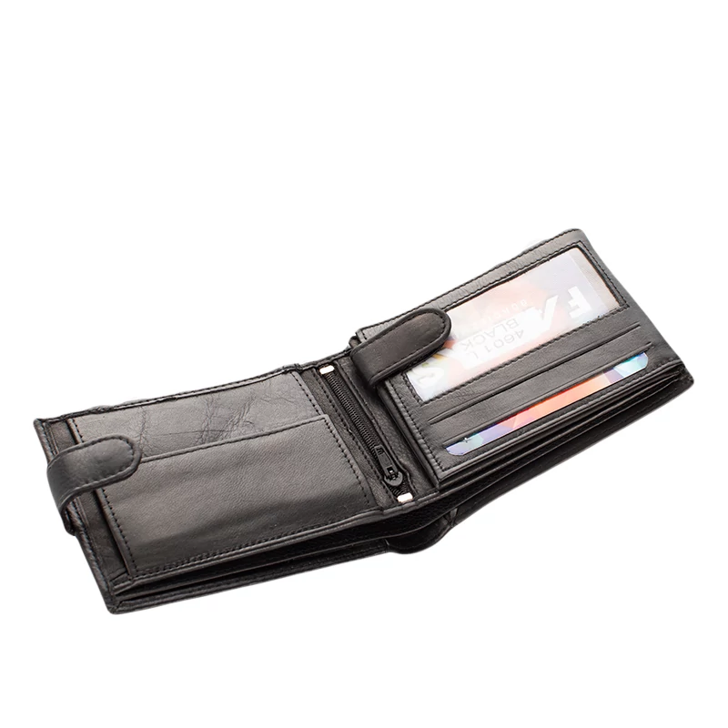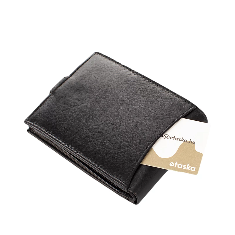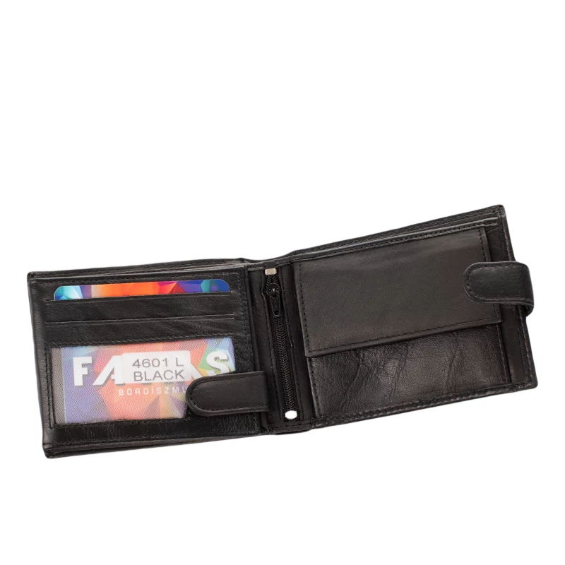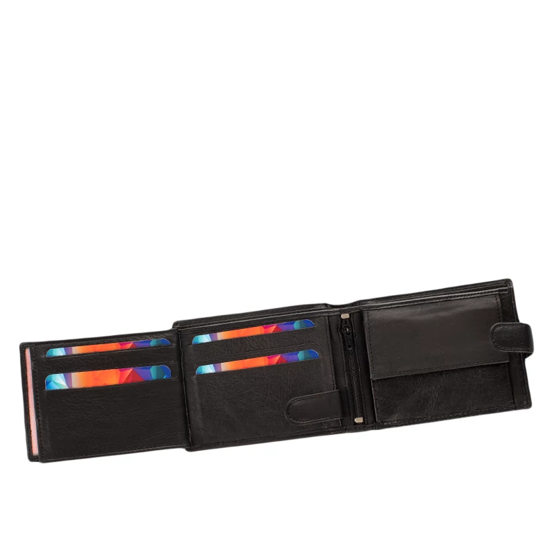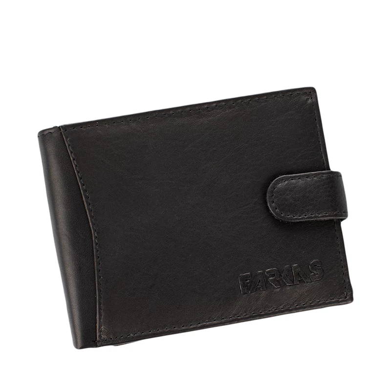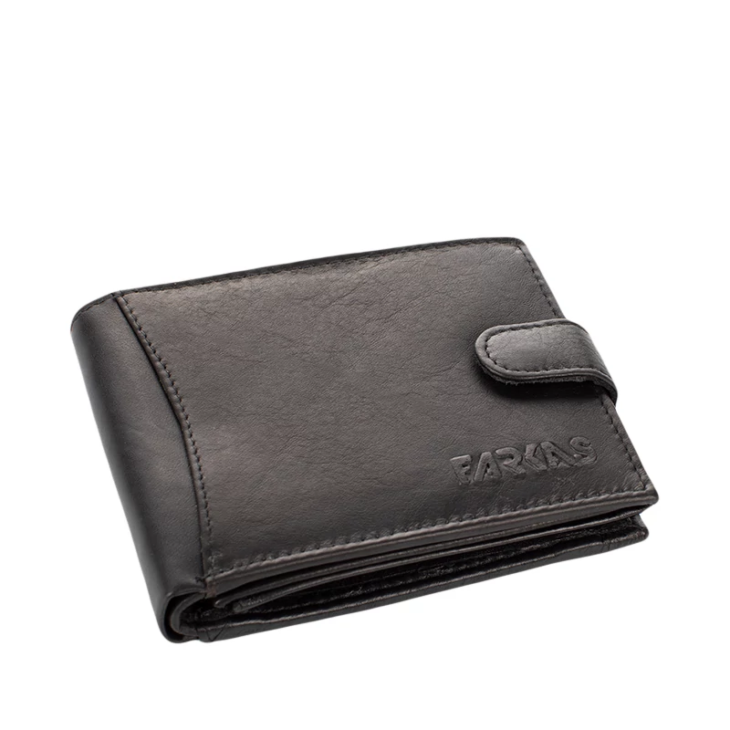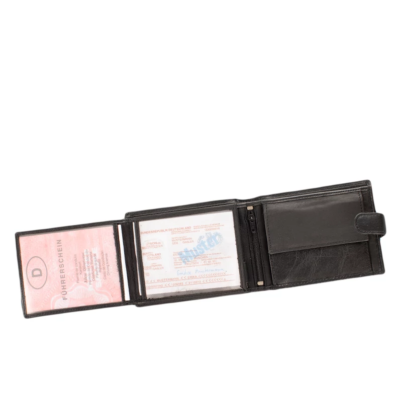 Kiváló minőségű bőrből készült férfi pénztárca varrott díszítéssel. Fedele patentos átkapcsolóval nyitható. Belsejének elrendezése hagyományos, praktikus. Két rekeszes papírpénztartó, egy cipzáras zseb, egy patenttal nyíló aprópénztartó és egy könyvszerűen lapozható kártyatartó rész található meg benne. Összesen 10 kártyának van itt hely.