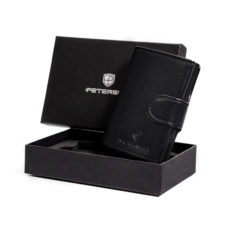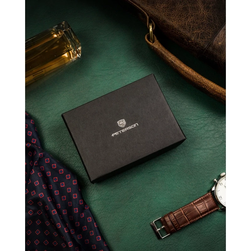 Elegáns pénztárca a lengyel PETERSON® márkától. Kiváló minőségű, sima ökológiai bőrből készült . Csattal és tömör retesszel rögzítve. Az előlapon minimalista márkalogó található