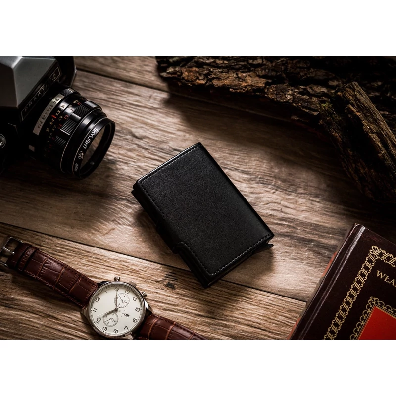 A pénztárca egy intelligens rendszerrel ellátott védőkártya tokkal van felszerelve az egyszerű kártyaeltávolítás érdekében - csak húzza meg a kis kart, és a kártyák azonnal kicsúsznak. Alumíniumból készült , védi a kártyákat a hajlítástól, törésektől és a nem kívánt érintés nélküli tranzakcióktól ( RFID Blocking SYSTEM technológia )