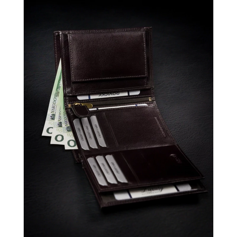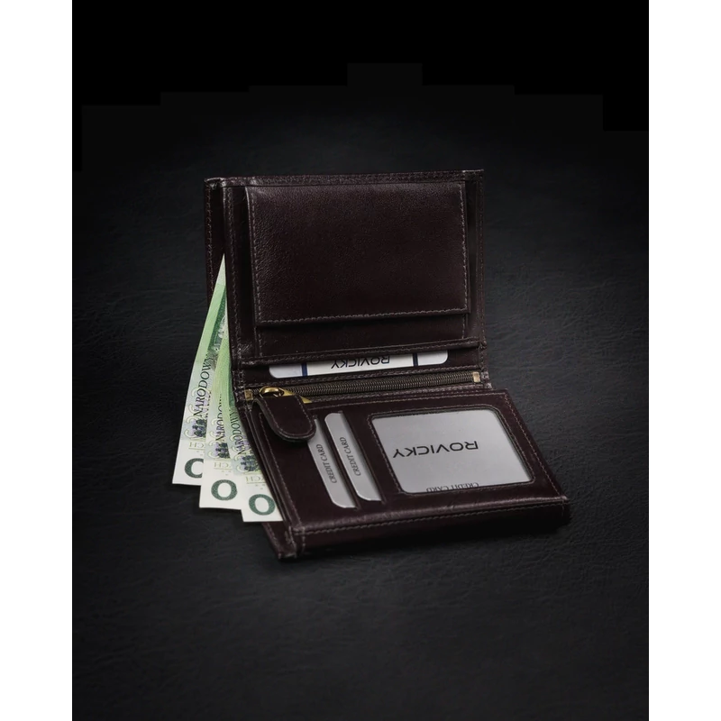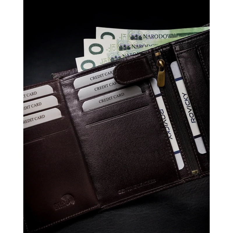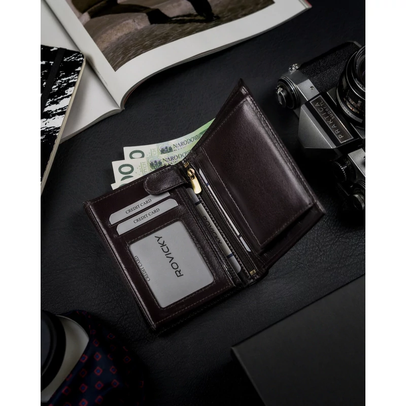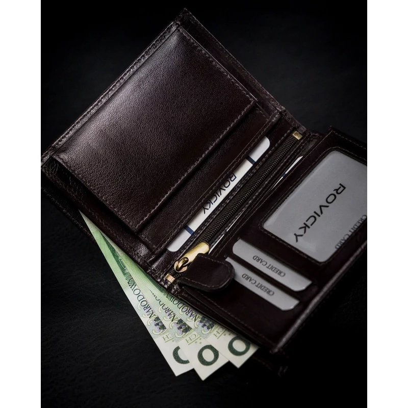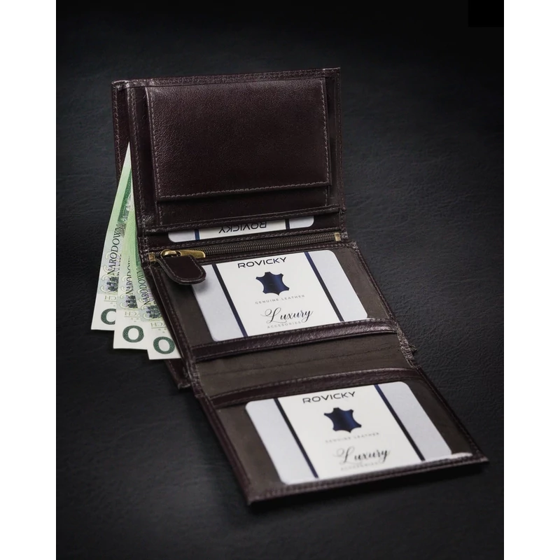 Férfi pénztárca a lengyel Rovicky® márkától , nagyon tartós, természetes szemcsés marhabőrből, finoman fényes. Hagyományos módon készült, puha és kellemes tapintású. Az ebből az anyagból készült pénztárcát választva biztos lehet benne, hogy évekig kitartó terméket vásárol!