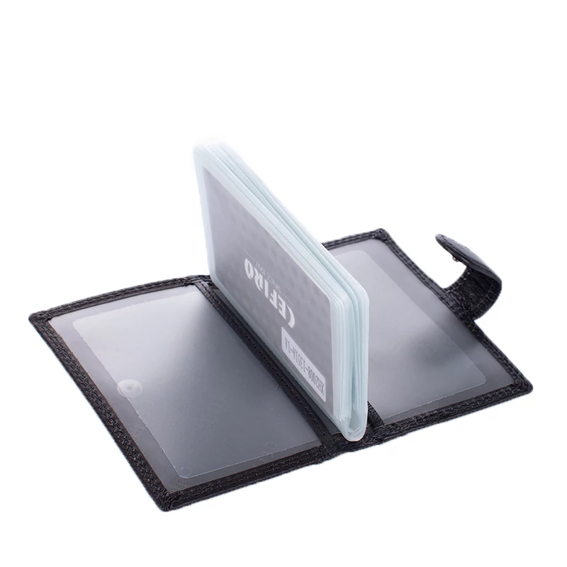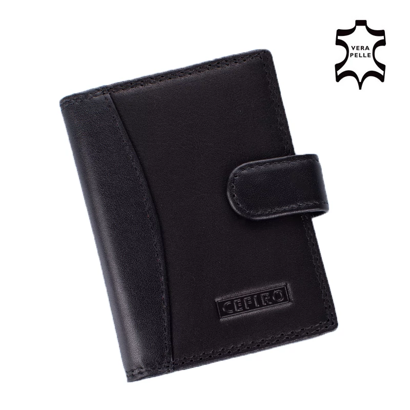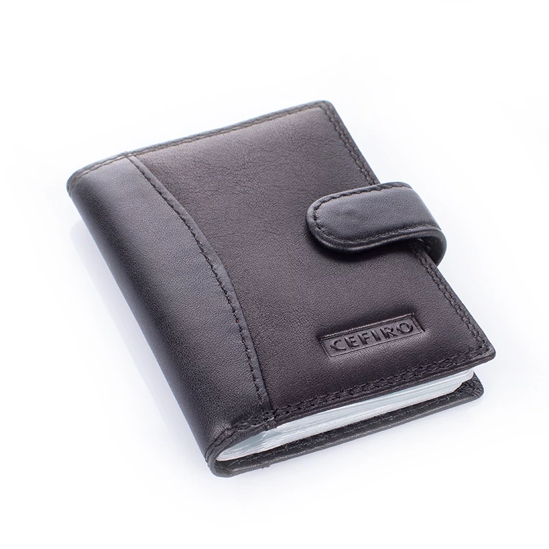 Cefiro márkájú, Elegáns kivitelű fekete bőr, kártyatartó, mely külső patentos pánttal zárható.