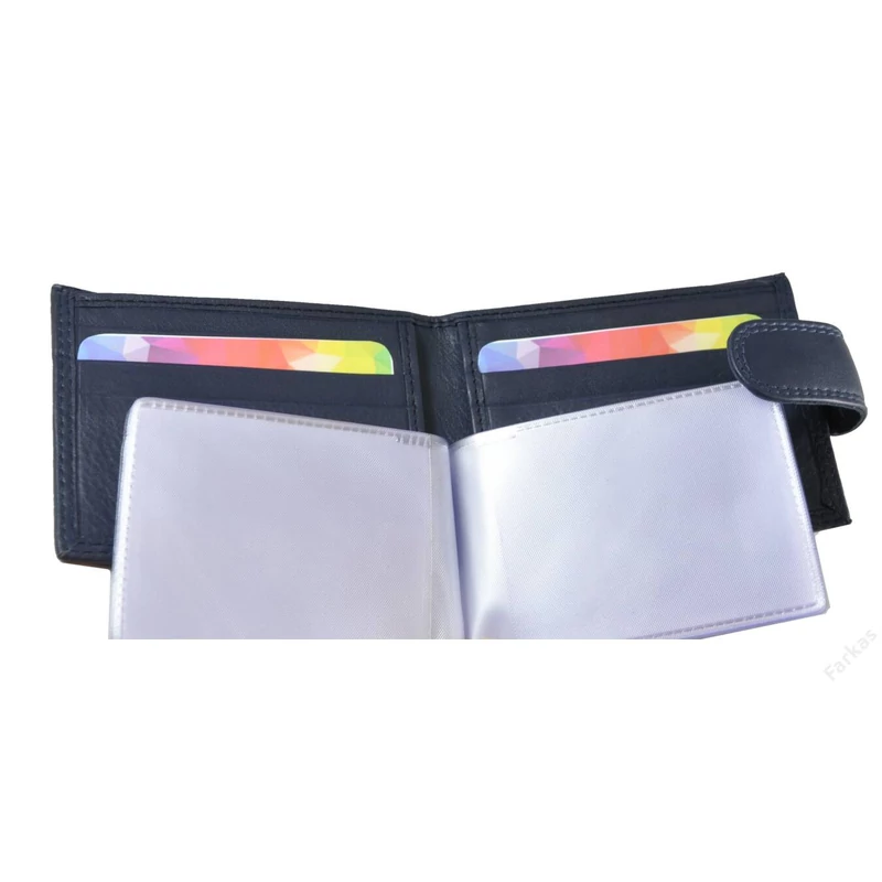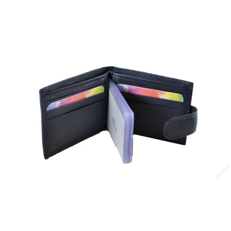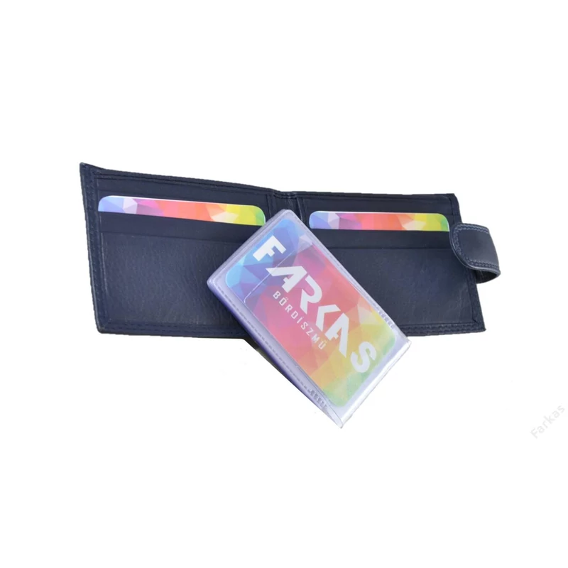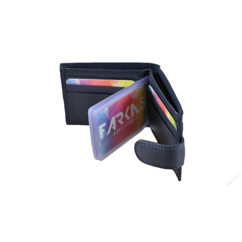 Fekvő fazonú kártyatartó prémium minőségű, kellemes tapintású bőrből. Nyomott "Farkas" felirat és dupla varrás díszíti. Fedele átkapcsolóval nyitható. Belsejében a kártyatartó rész kivehető, így külön-külön használható a külső és a belső rész. Két rekeszes papírpénztartóval is rendelkezik. A külső bőr részben összesen 8 db kártyának van hely, míg a kivehető fóliás részbe 20 db kártyát tehetünk.