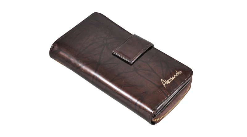 Elegáns, fényes lakkbőrből készült, álló fazonú bőrpénztárca. A tárca egy patentos átkapcsoló fülecskével nyílik. Belül lapozható kártyatartó rész található. A papírpénztartó kettő rekeszes, összesen 15 db kártyatartó hellyel (abból egy "ablakos") és 5 igazolványtartó hellyel rendelkezik (abból egy "ablakos"). A pénztárca hátulján cipzárral nyílik a két rekeszes aprópénztartó; azonfelül egy további kis cipzáros zseb van ide elhelyezve.