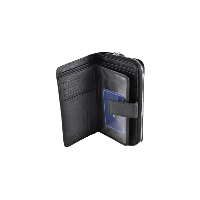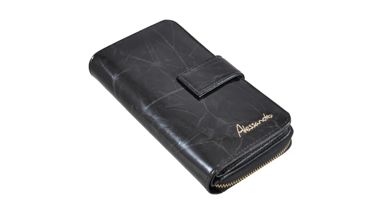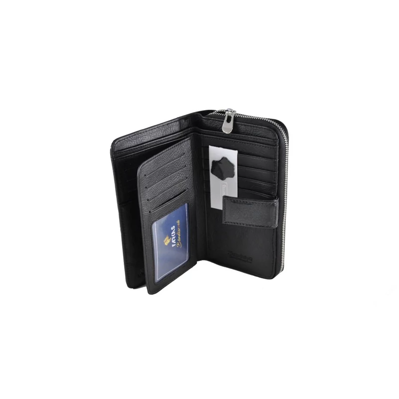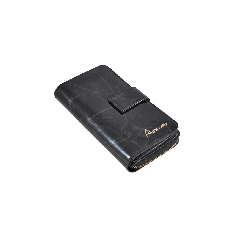 Elegáns, fényes lakkbőrből készült, álló fazonú bőrpénztárca. A tárca egy patentos átkapcsoló fülecskével nyílik. Belül lapozható kártyatartó rész található. A papírpénztartó kettő rekeszes, összesen 15 db kártyatartó hellyel (abból egy "ablakos") és 5 igazolványtartó hellyel rendelkezik (abból egy "ablakos"). A pénztárca hátulján cipzárral nyílik a két rekeszes aprópénztartó; azonfelül egy további kis cipzáros zseb van ide elhelyezve.