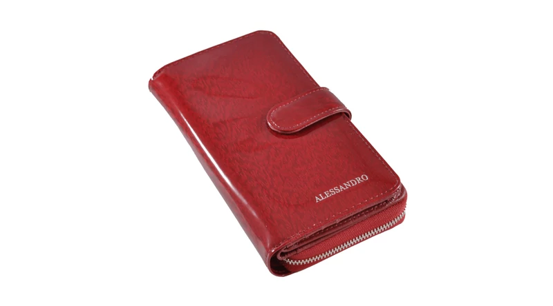 Elegáns, fényes lakkbőrből készült, álló fazonú bőrpénztárca. A tárca egy patentos átkapcsoló fülecskével nyílik. Belül lapozható kártyatartó rész található. A papírpénztartó kettő rekeszes, összesen 15 db kártyatartó hellyel (abból egy "ablakos") és 5 igazolványtartó hellyel rendelkezik (abból egy "ablakos"). A pénztárca hátulján cipzárral nyílik a két rekeszes aprópénztartó; azonfelül egy további kis cipzáros zseb van ide elhelyezve.