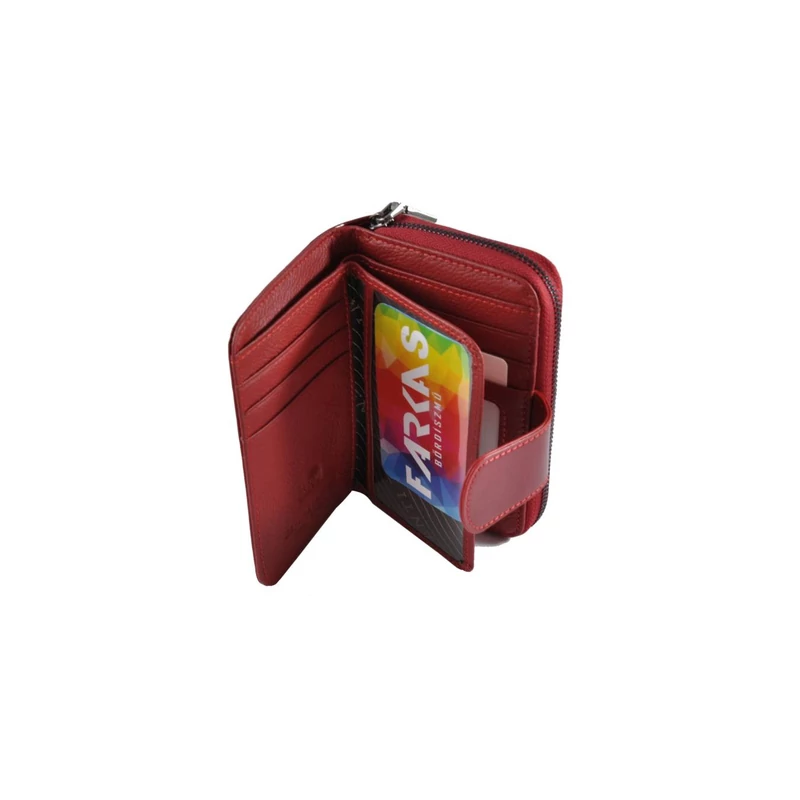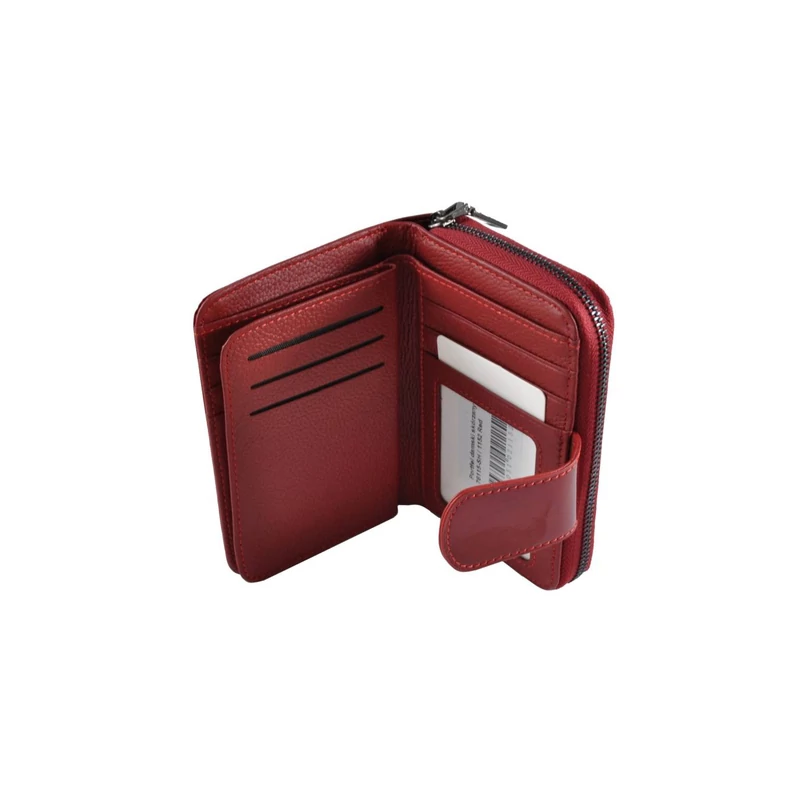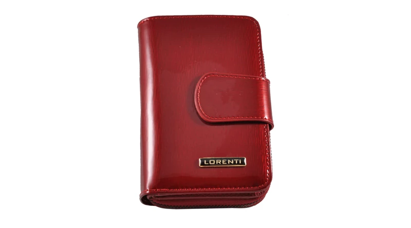 Elegáns, fényes lakkbőrből készült, álló fazonú bőrpénztárca. A tárca egy patentos átkapcsoló fülecskével nyílik. Belül lapozható kártyatartó rész található. A papírpénztartó egy rekeszes, összesen 9 db kártyatartó hellyel és négy igazolványtartó hellyel rendelkezik (abból egy "ablakos"). A pénztárca hátulján cipzárral nyílik a két rekeszes aprópénztartó.