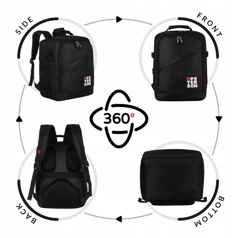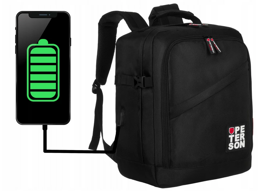 Peterson 3- Funkciós Utazó Hátizsák, WizzAir méretű 40x30x20cm, Fekete-Piros Színben / USB csatlakozóval
