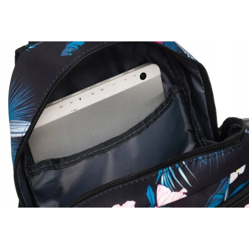 Kis mérete ellenére a hátizsák nagy, dupla cipzárral zárható rekesszel van felszerelve, amelyben 1 nyitott zseb is található .